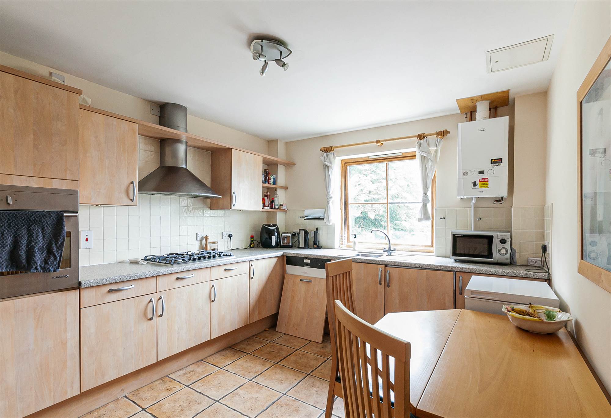 Range of high and low level units, ceramic tiled floor, integrated fridge freezer, electric oven, 5 ring gas hob stainless steel extractor fan, stainless steel sink unit, integrated washing machine, part tiled walls
