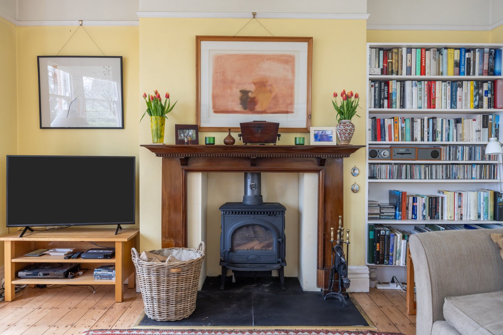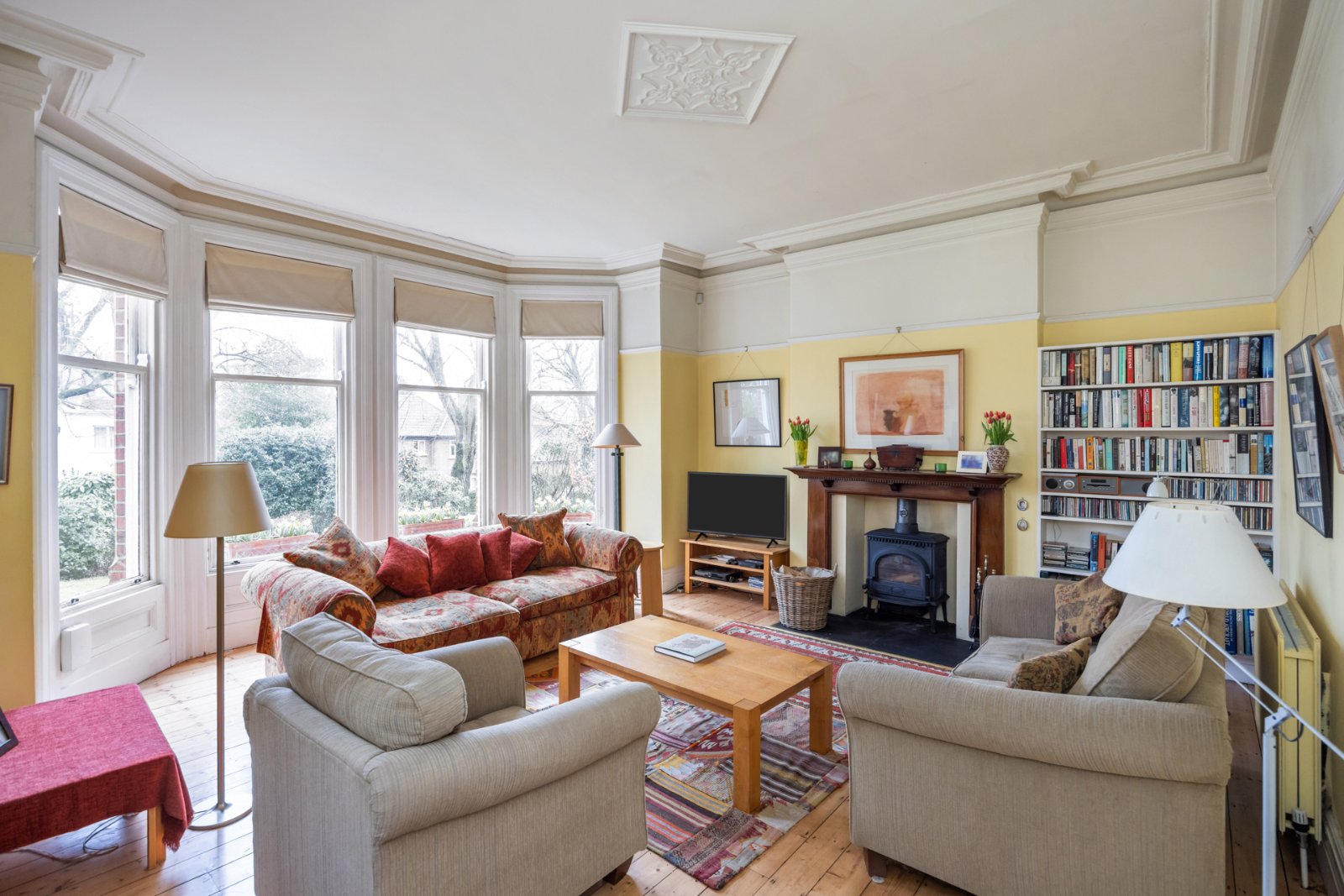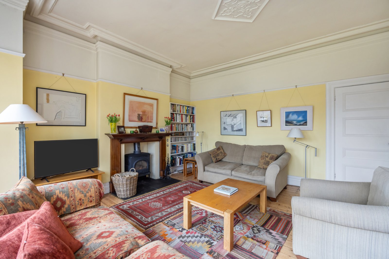 Solid wooden florring, cornice ceiling and picture rail, wood burning stove on tiled hearth