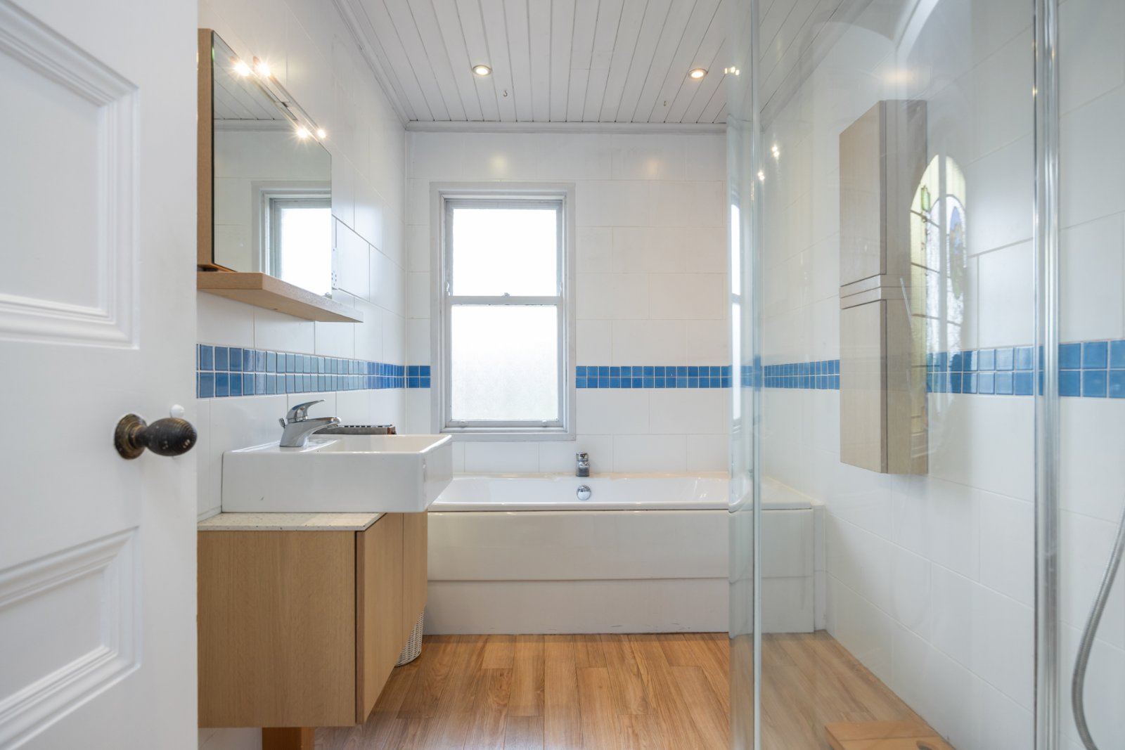 White suite comprising panelled bath, vanity unit, corner shower cubicle