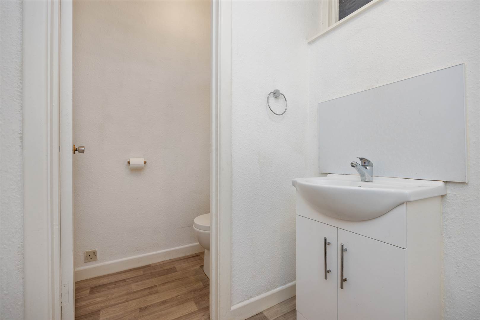 Wash hand basin, separate low flush wc, separate shelved storage.