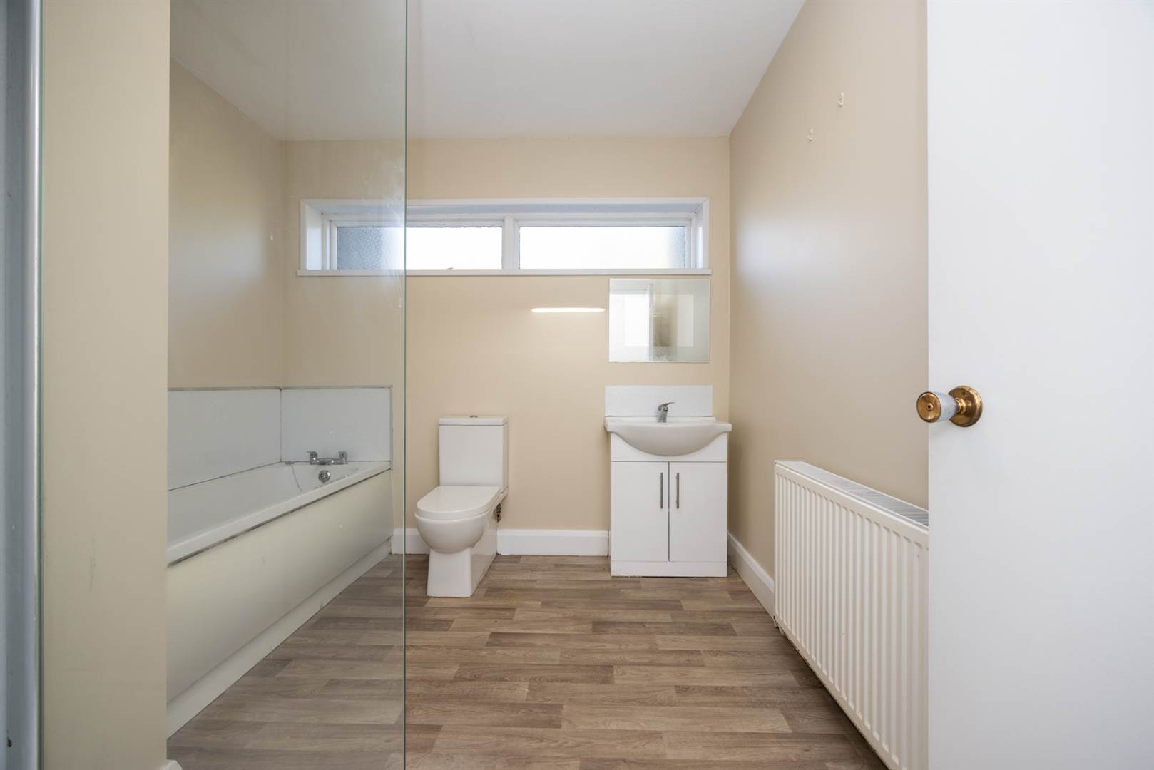White suite comprising panelled bath, low flush wc, vanity wash hand basin, large shower cubicle.