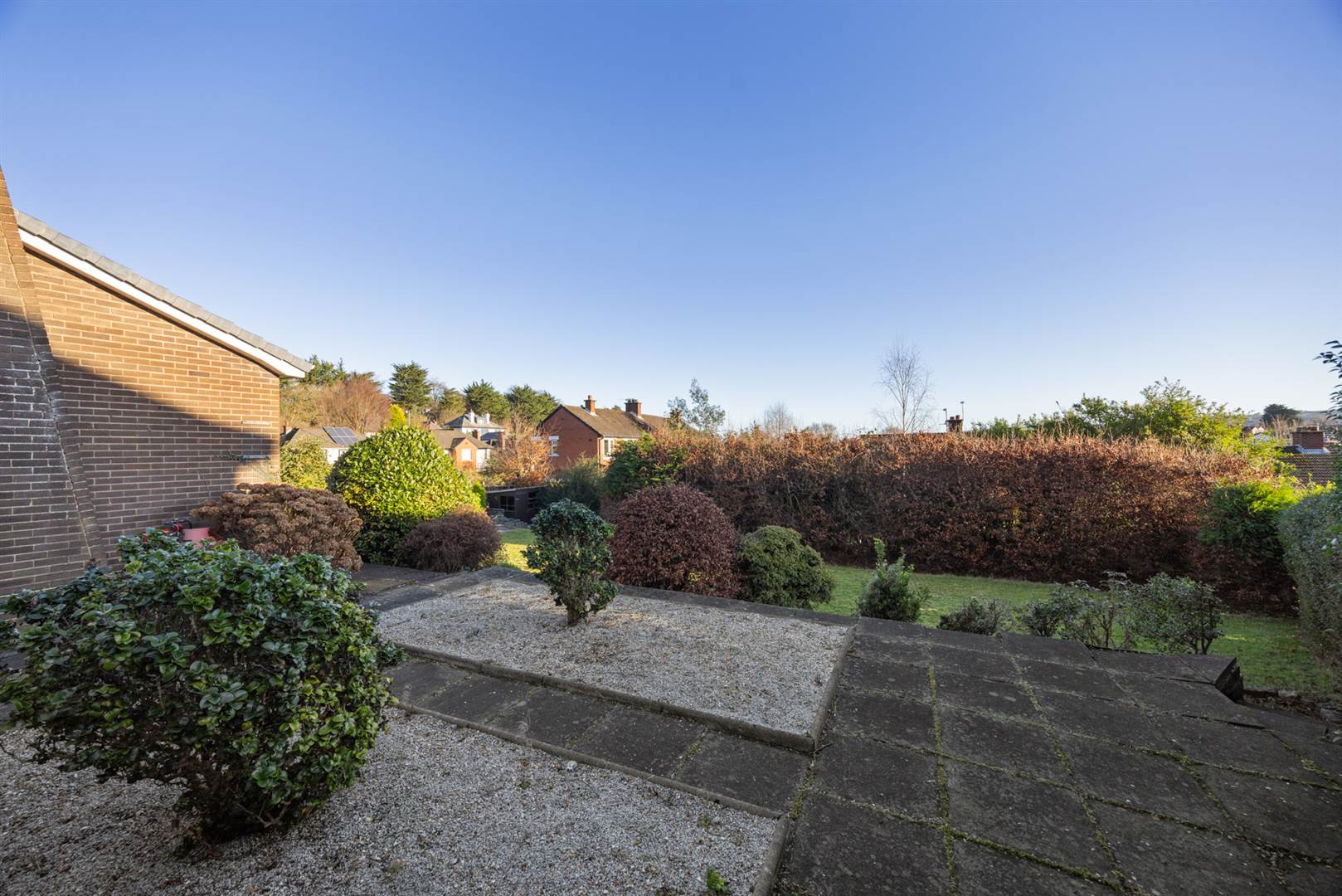 Mature gardens on a corner site in lawns, flowerbeds, shrubs and hedges. Flagged paths and patio.