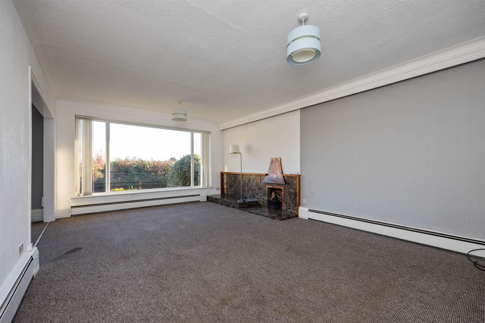 Feature fireplace, gas fire inset, view into rear garden, open to dining with potential for double doors to: