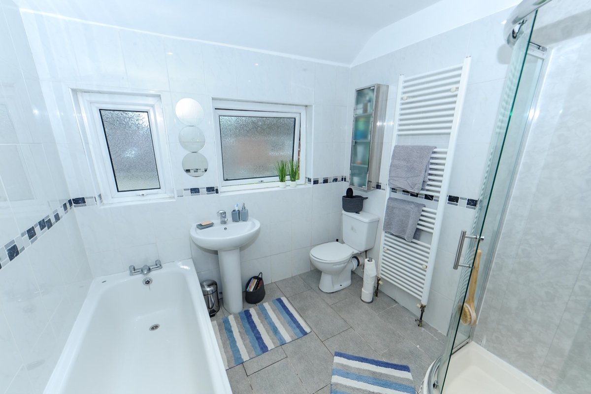 Low flush WC. Tiled bath with mixer taps. Pedestal wash hand basin with mono tap. Tiled walls. Heated towel rail. Corner shower cubicle with electric shower and pvc panelled walls. Tiled floor. Extractor fan. Recessed spotlights.
