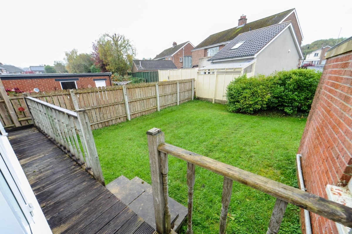 Driveway for off street parking. Front garden laid in loose stones. Rear garden laid in lawn with raised decking.