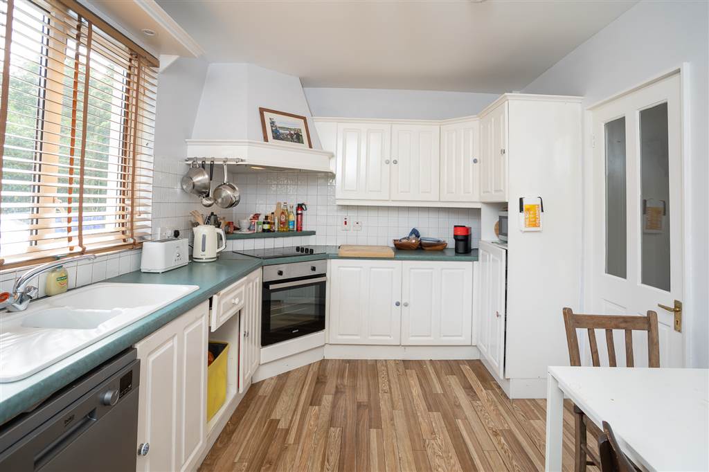 High and low level units, laminate work surfaces, laminate flooring, stainless steel sink and drainer, tiled splashback, halogen hob and integrated oven.