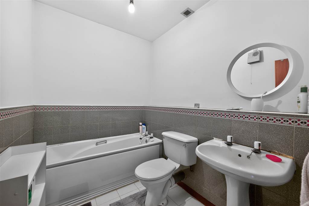 Comprising of panel bath, low flush wc, wash hand basin, half tiled walls and tiled floor.