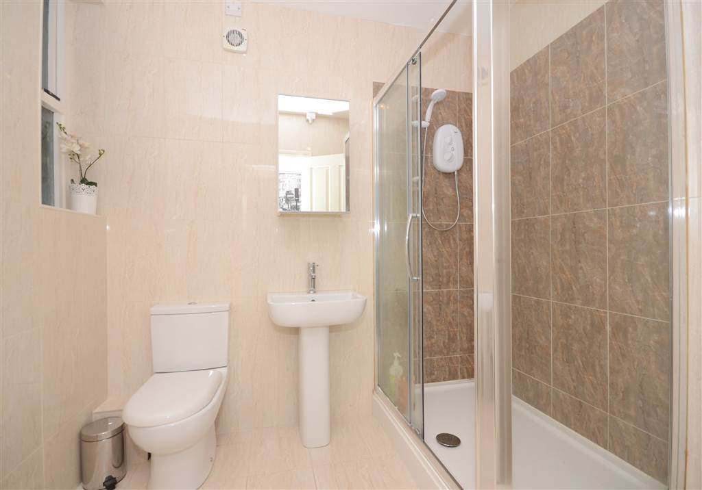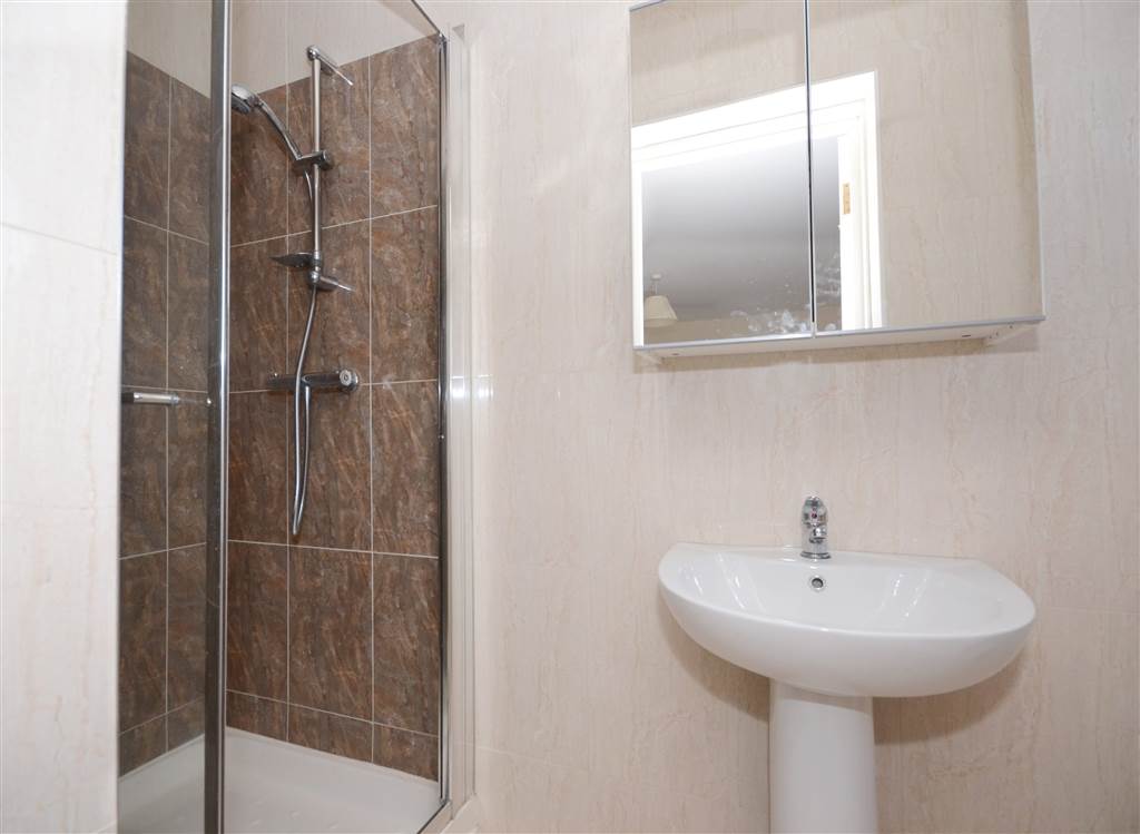 Double shower with Mira shower, low flush wc, wash hand basin, bathroom cabinet.Fully tiled.