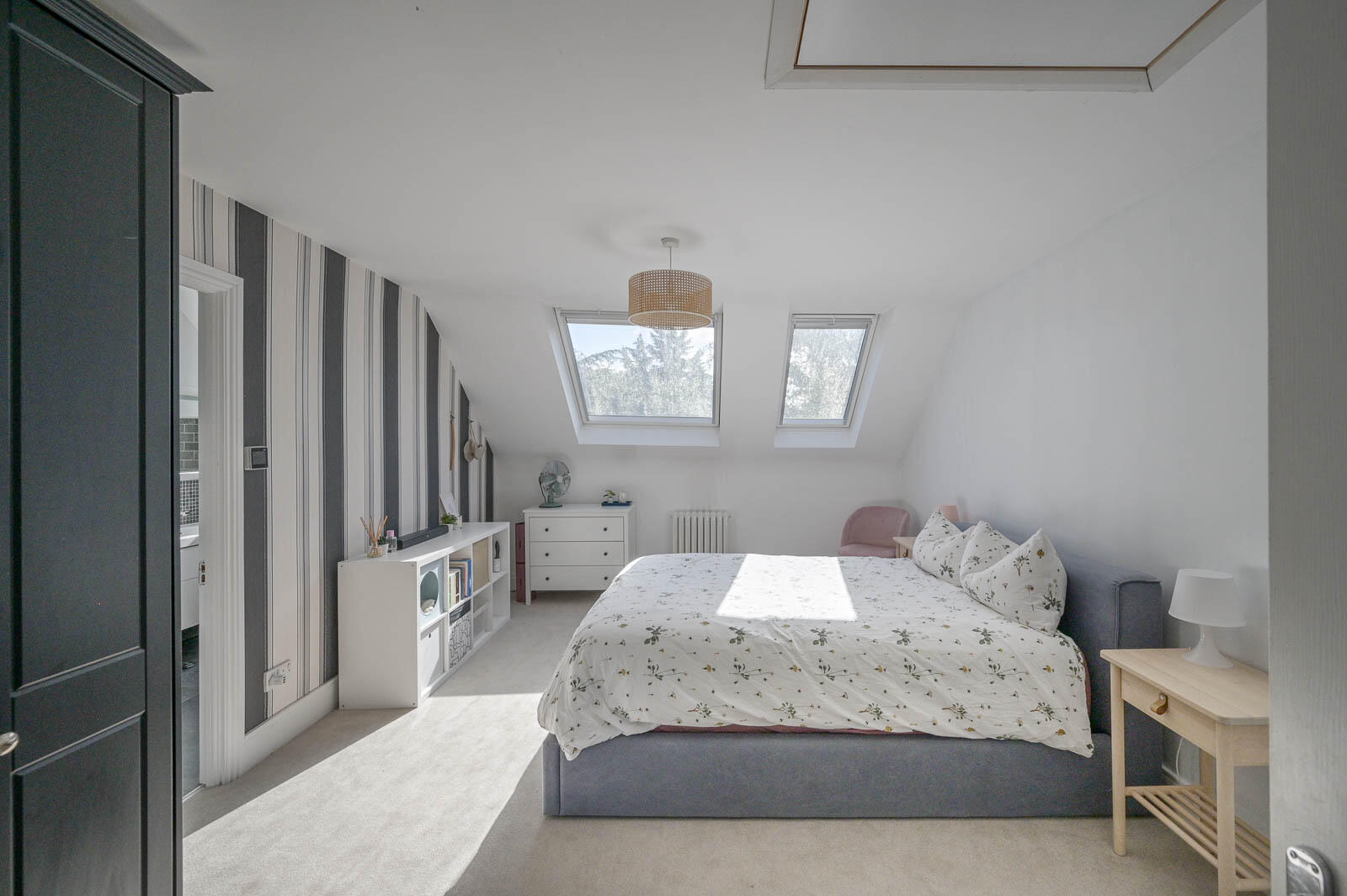 With range of built-in wardrobes, two Velux windows, access to roofspace.