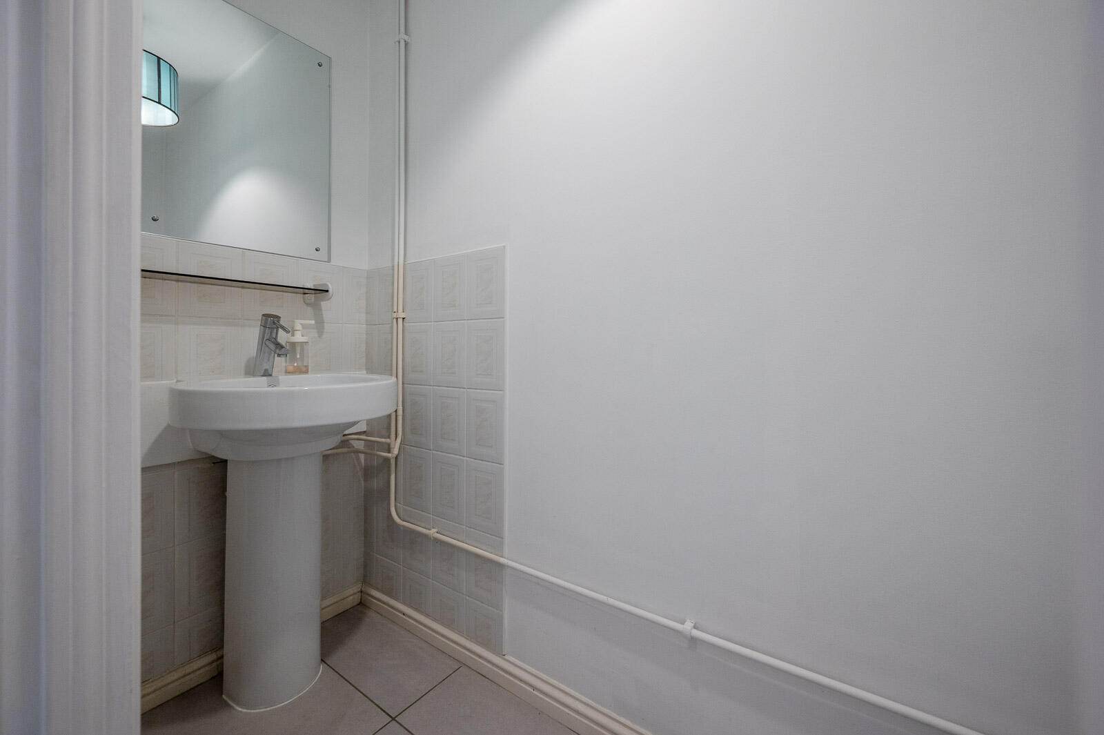 With low flush WC, pedestal wash hand basin, extractor fan, and tiled flooring.