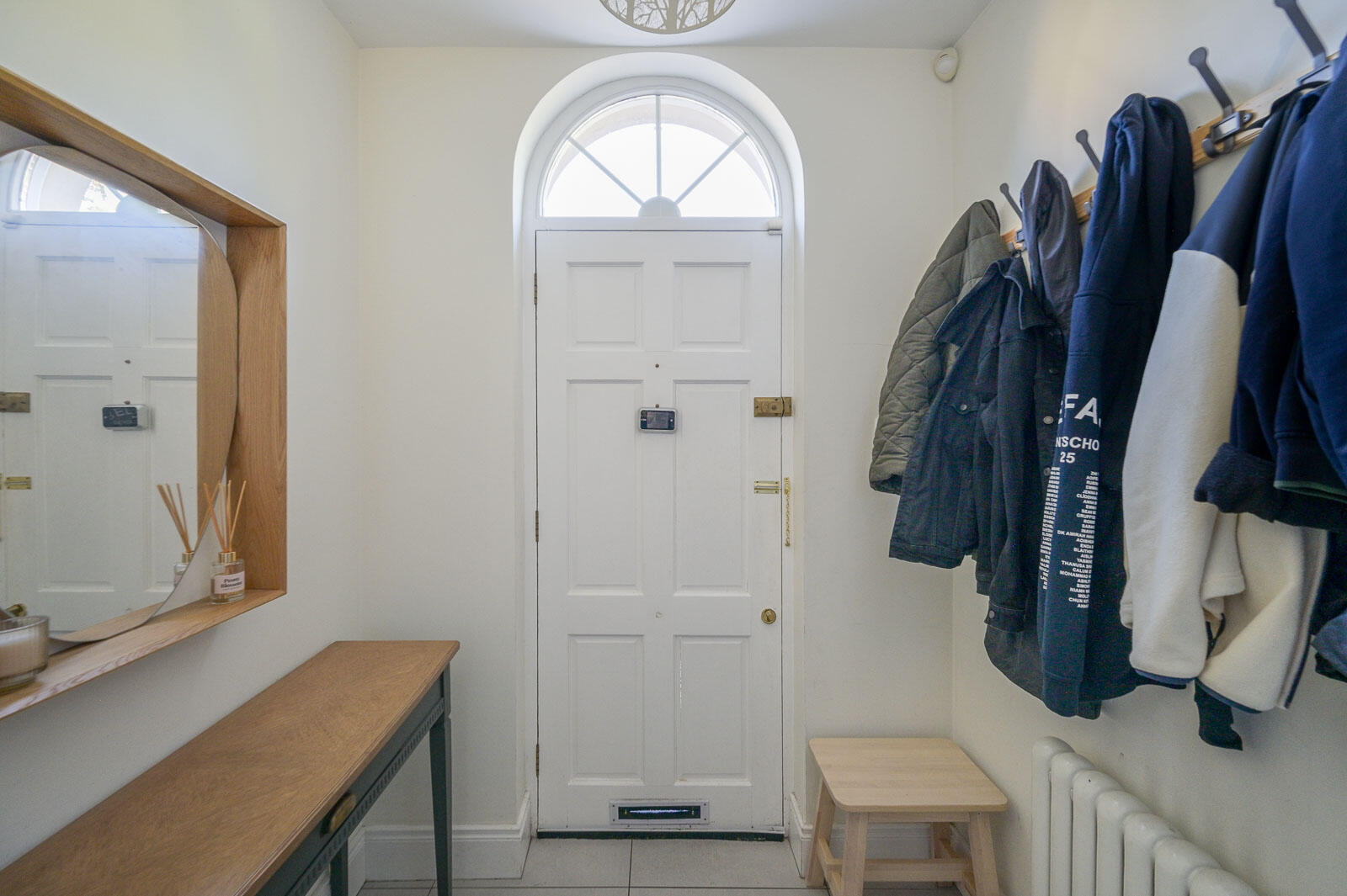 Tiled floor, storage cupboard with cloaks space and shelving.