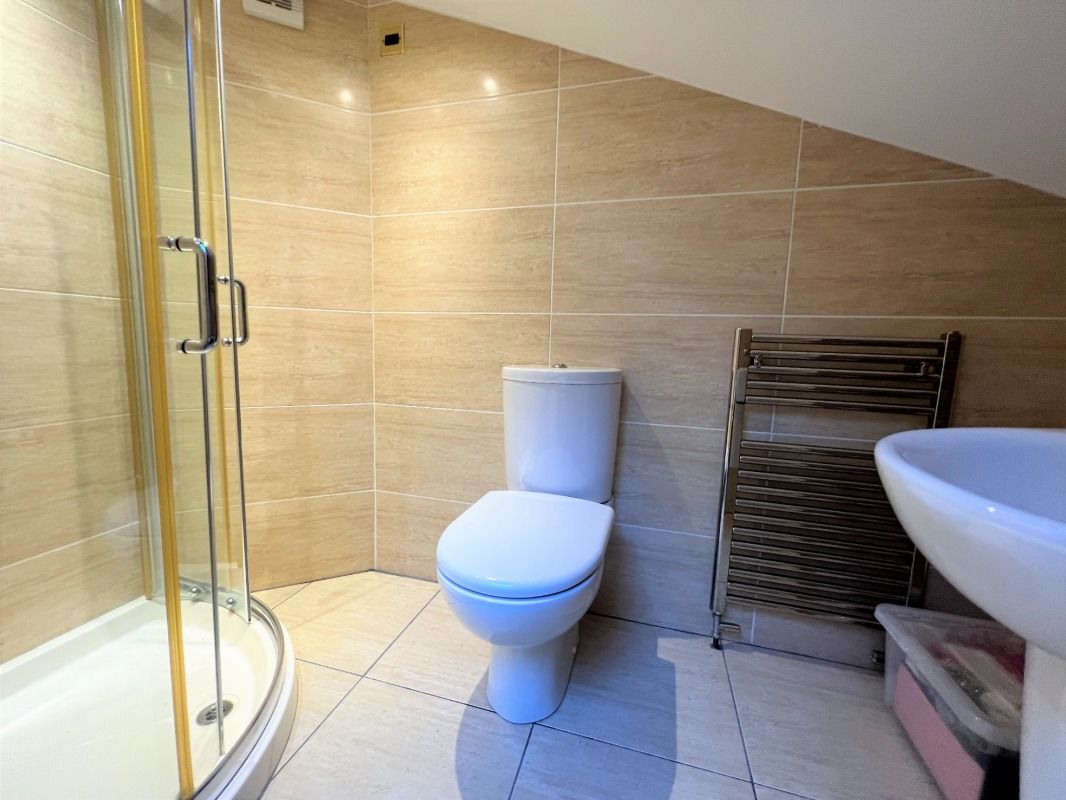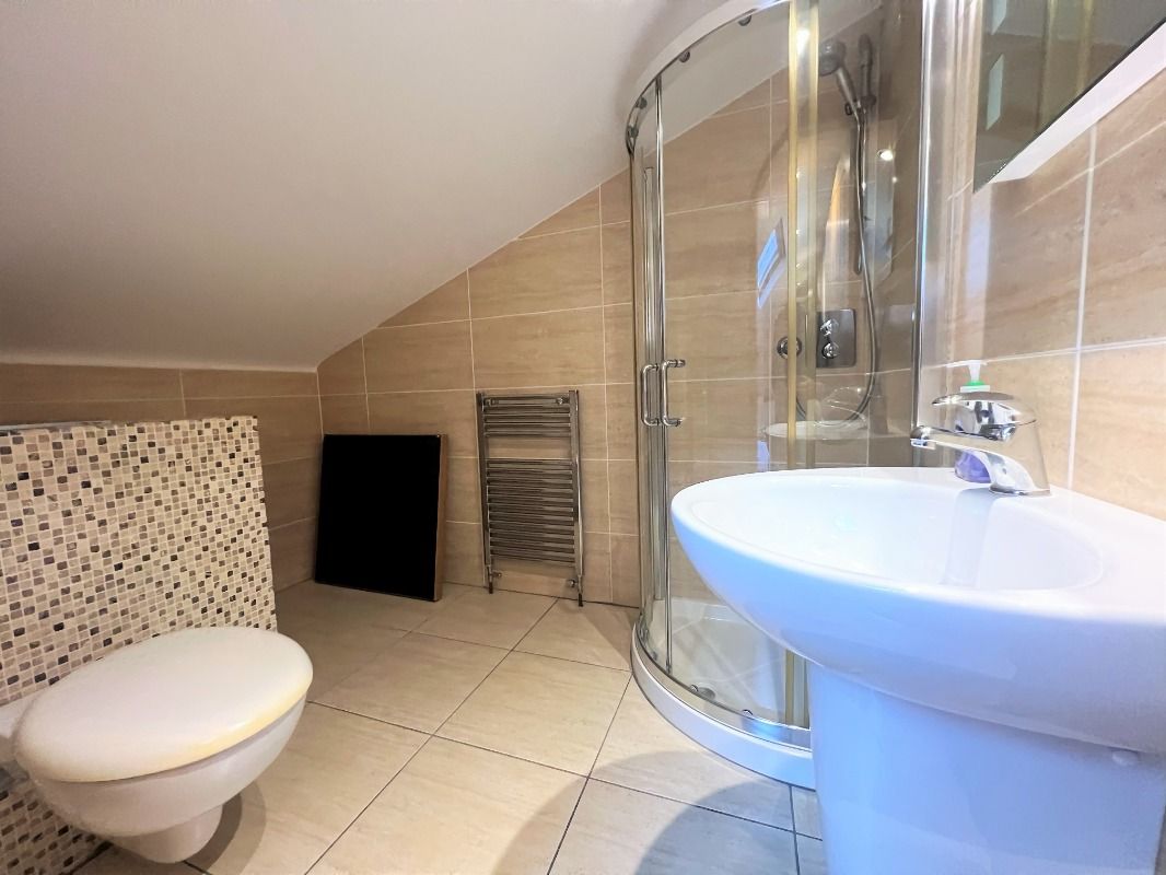 This Ensuite bathroom features a shower, w/c and a wash hand basin. The room boasts fully tiled floors and walls throughout. As well as a stylish towel radiator.