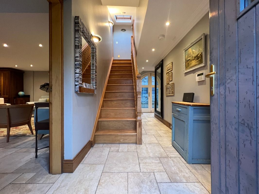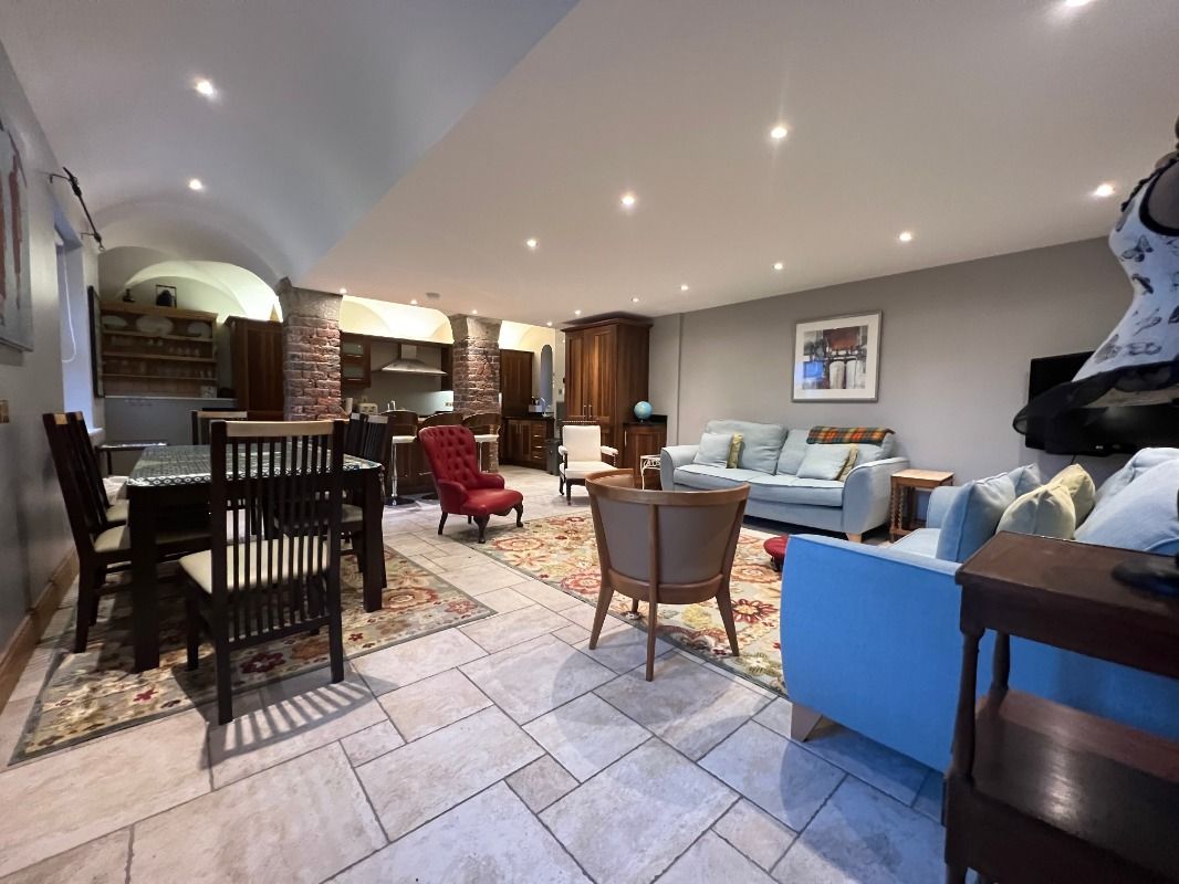 The living room is spacious but cosy, offering stylish spotlights and high-quality finishes throughout. The kitchen and dining areas feature attractive Georgian-style sash windows.