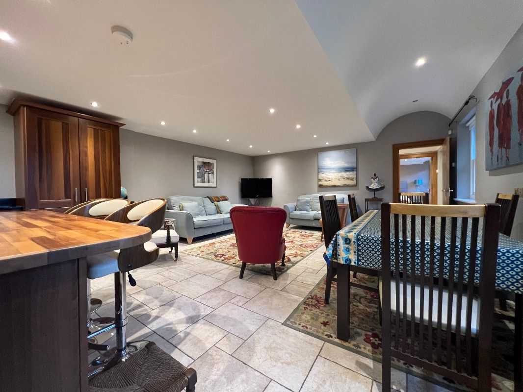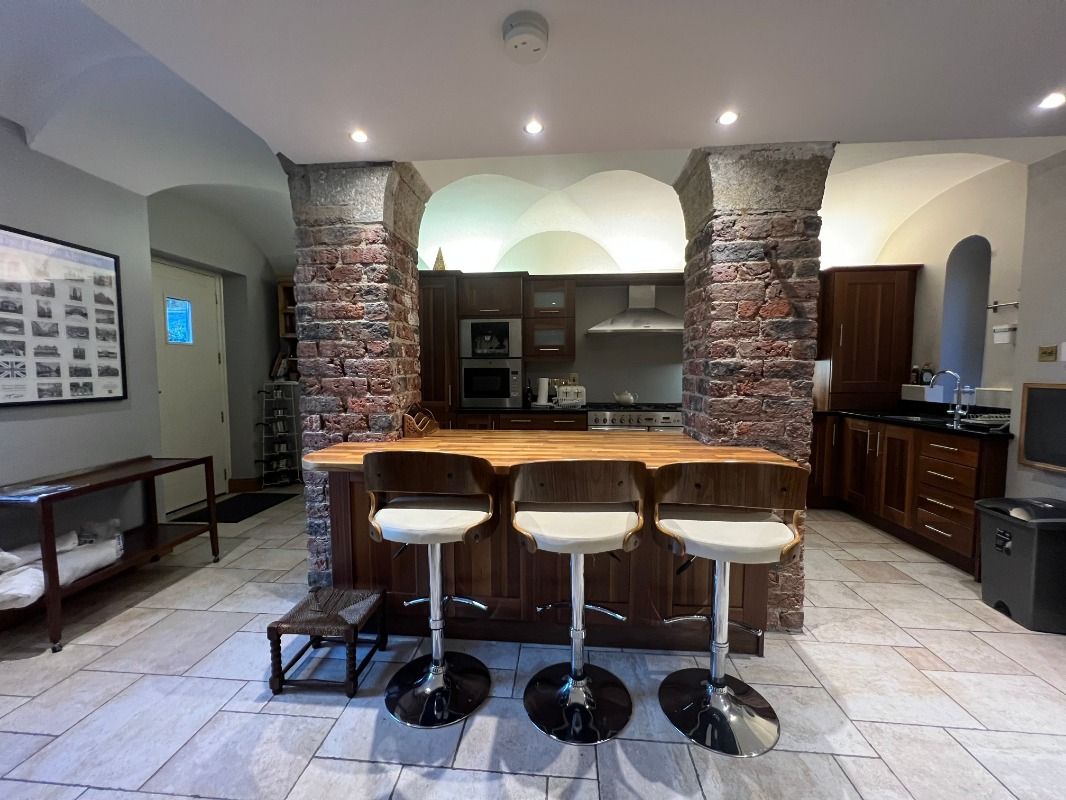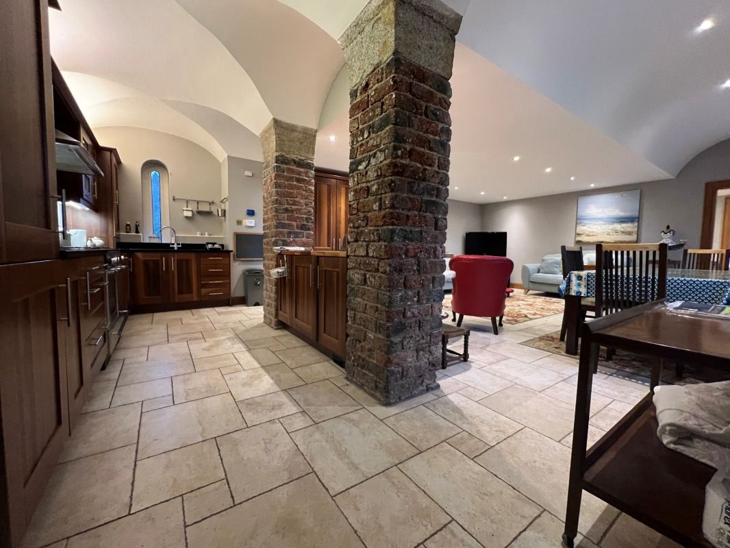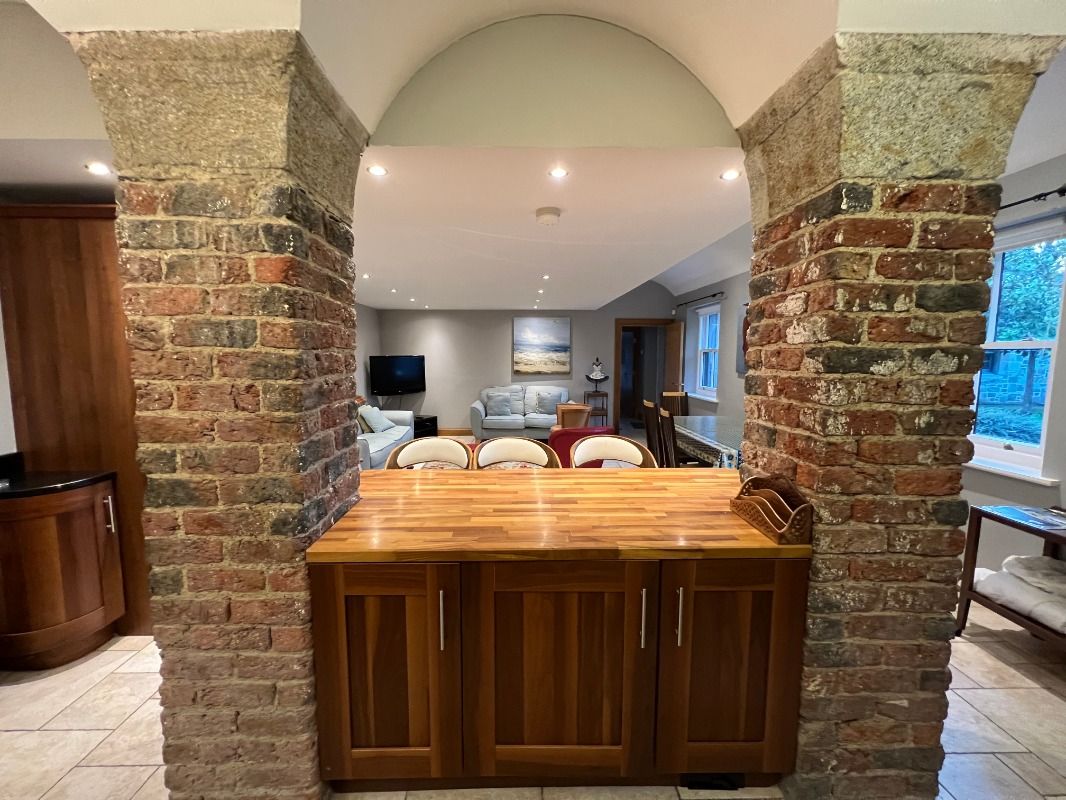 The stunning open-plan kitchen and living room features tiled floors throughout, with the two areas separated by a stylish breakfast bar between two beautiful stone columns.