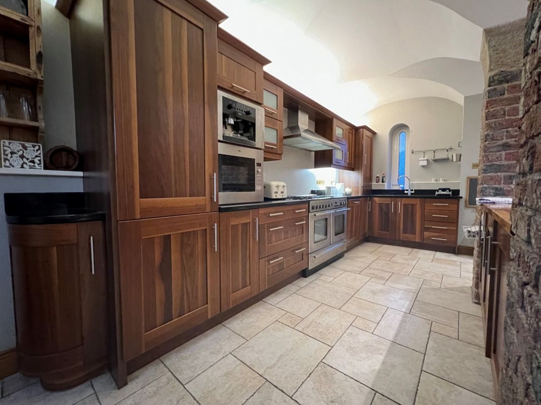 The modern kitchen units house a variety of integrated features including a fridge/ freezer, a microwave, and a coffee machine. The kitchen boasts dark marble countertops and excellent space with ample high and low units and a 1.5-basin stainless steel sink. The Rangemaster double-oven features five rings.