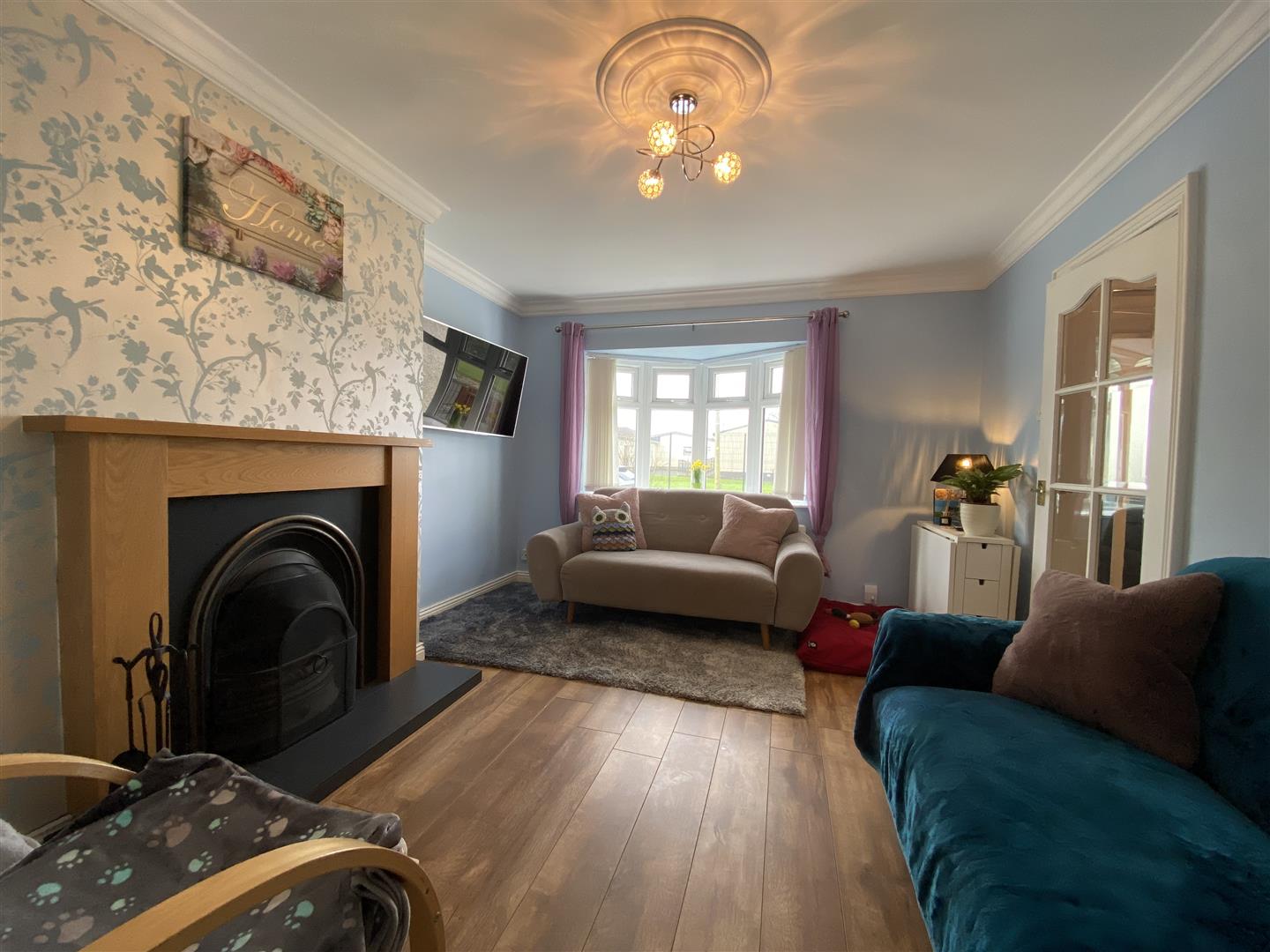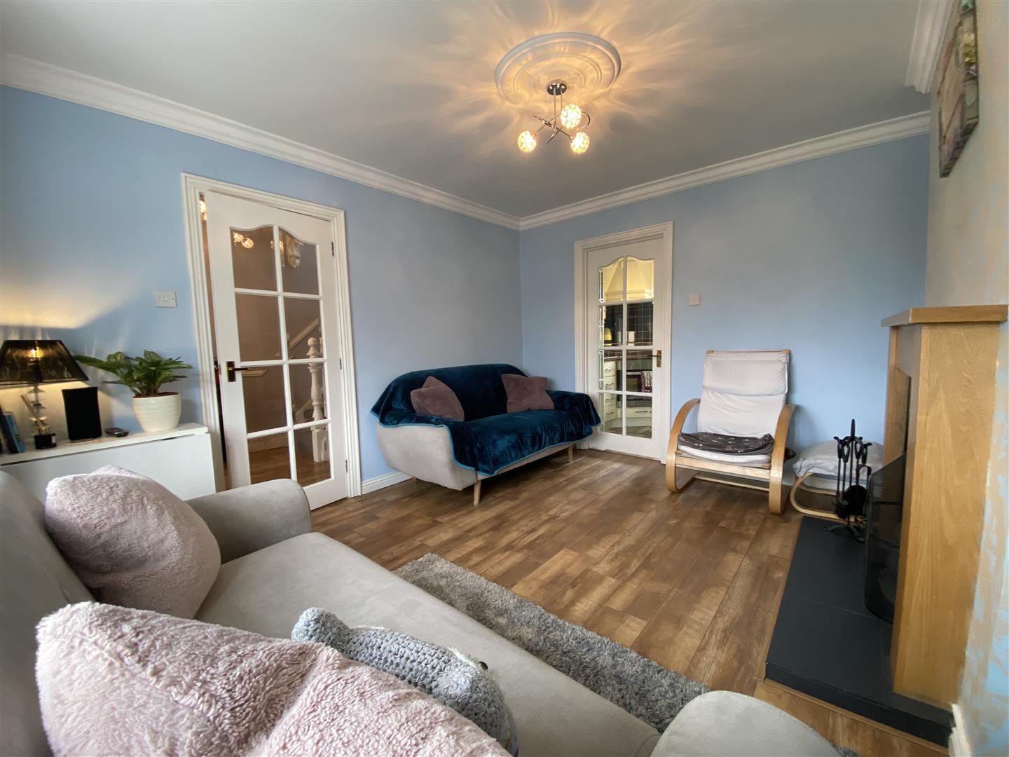 Having attractive fireplace with back boiler, ceiling cornicing, glazed door leading to hall and kitchen, laminated wooden floor.