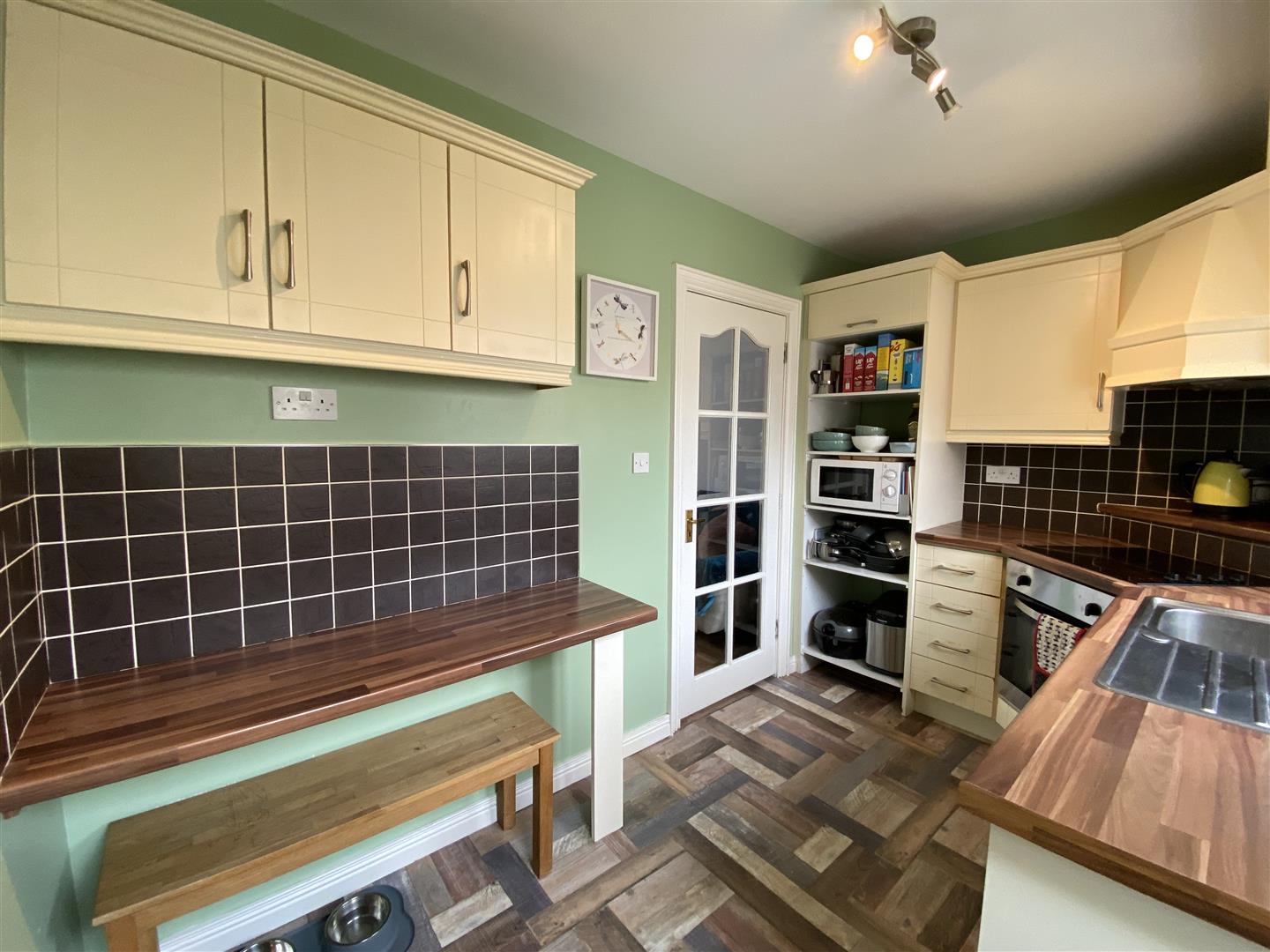 Having eye and low level units, matching pelmet over window and extractor canopy, tiling between units, hob and underoven, space for fridge / freezer, breakfast bar.
