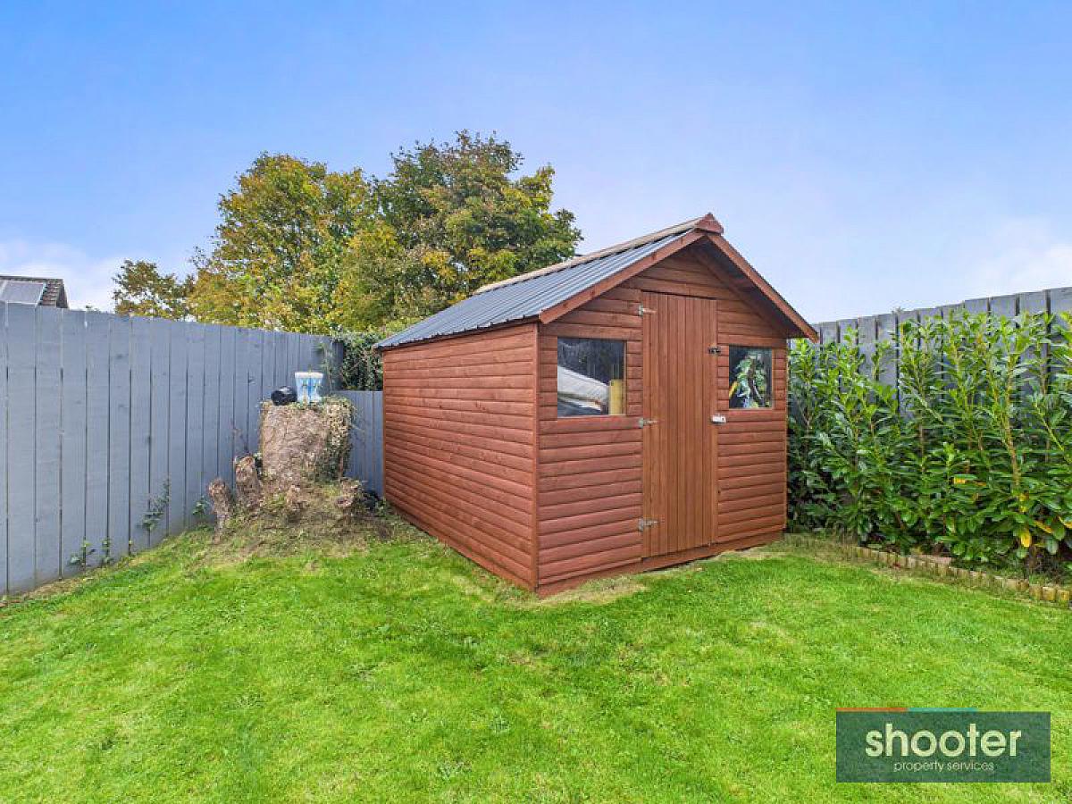 Tarmacadam / decorative stone driveway with parking to front and side. Natural stone / concrete wall and laurel hedge. Canopy shelter, outside light and post box. Enclosed rear garden with gated access to either side of property. Paved patio area. Large grass lawn with wooden fence boundary and laurel hedge. Garden shed. Outside light and water tap.