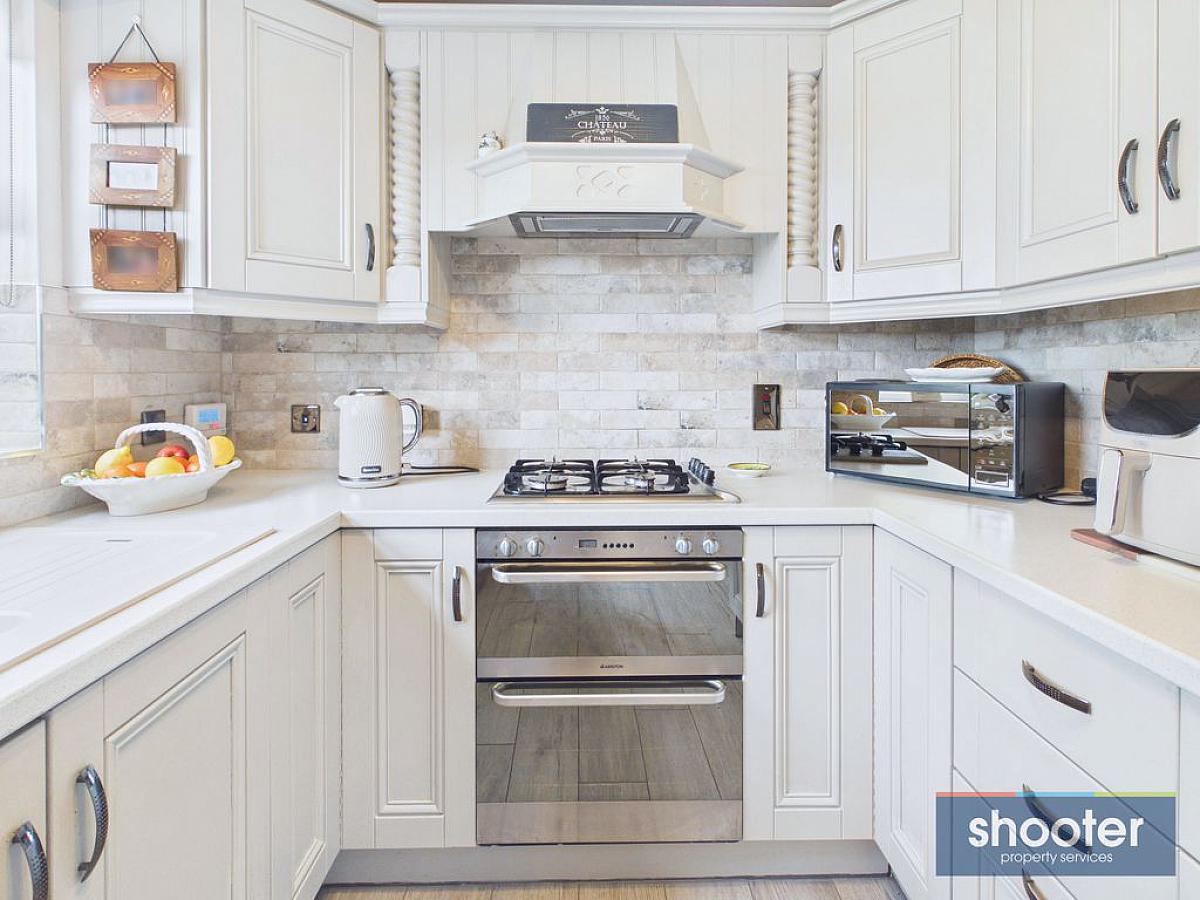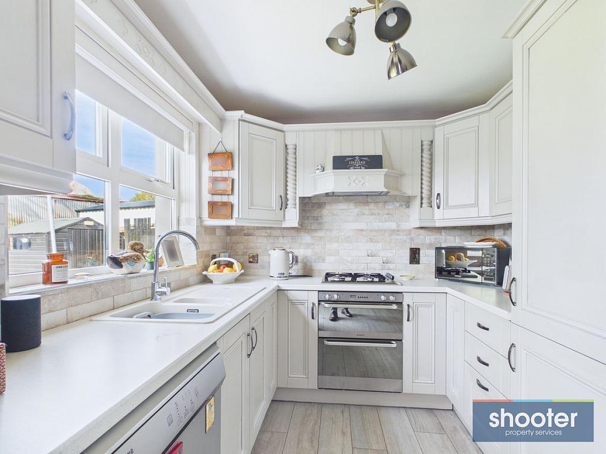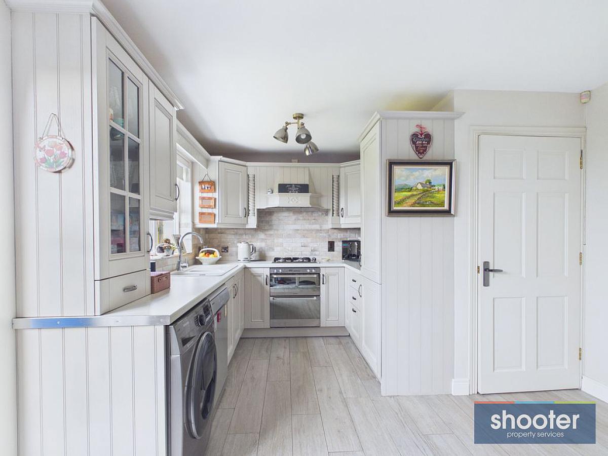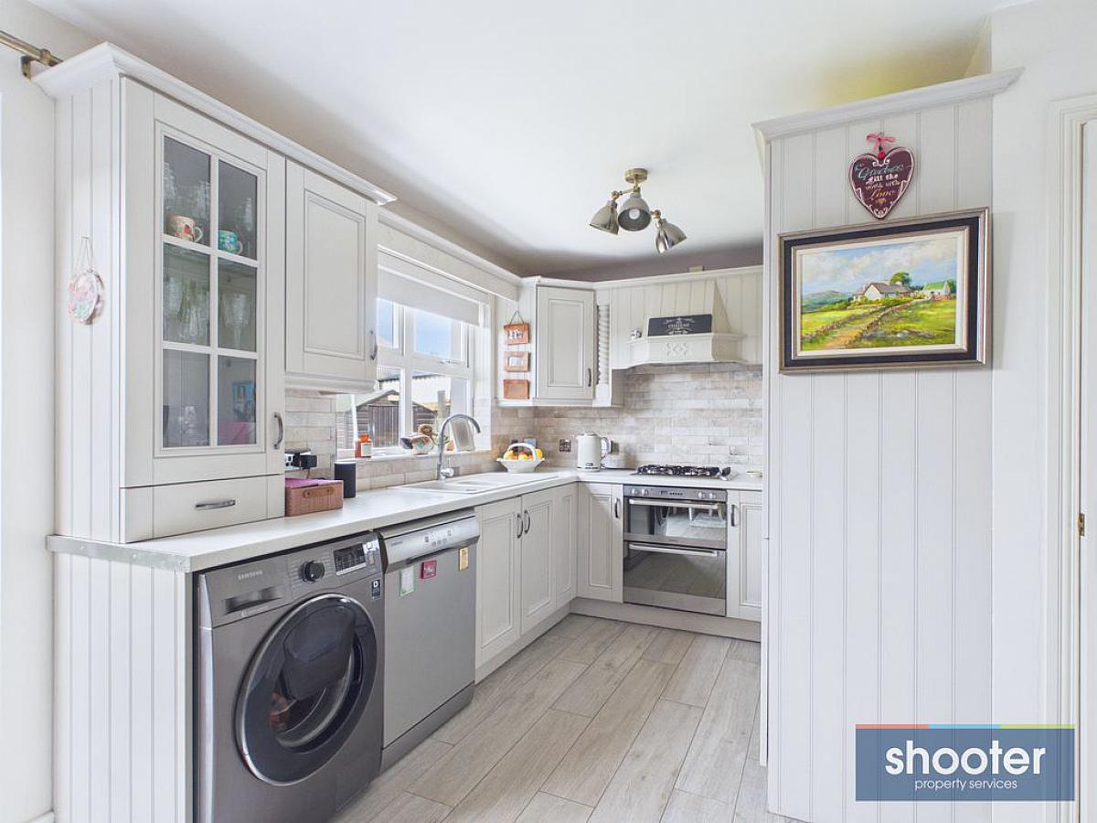 Modern range of high and low level units incorporating 1 1/2 sink unit, integrated Aristan oven and grill, gas hob, extractor fan and spaces for a washing machine and dishwasher. Television point. Ceramic tiled floor and part tiled walls. PVC sliding patio door to rear.