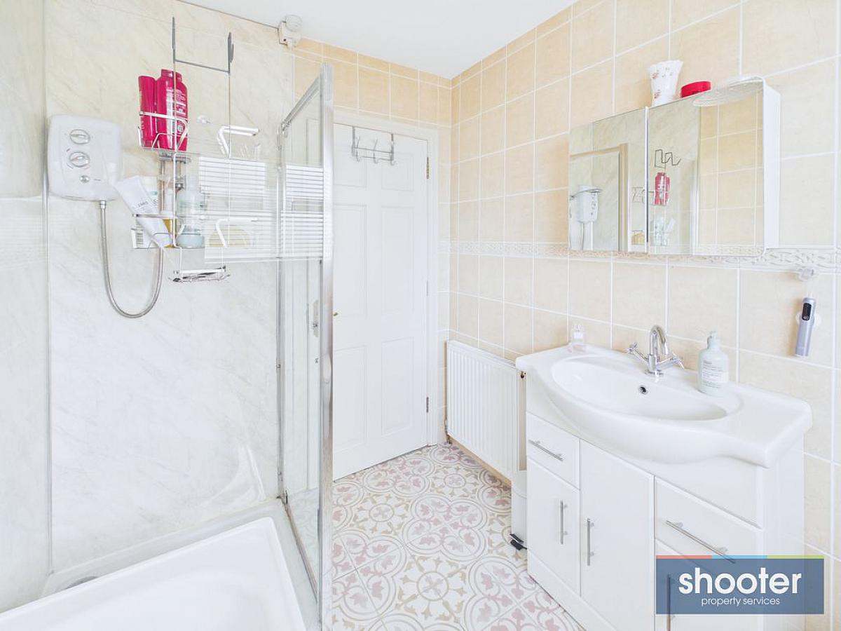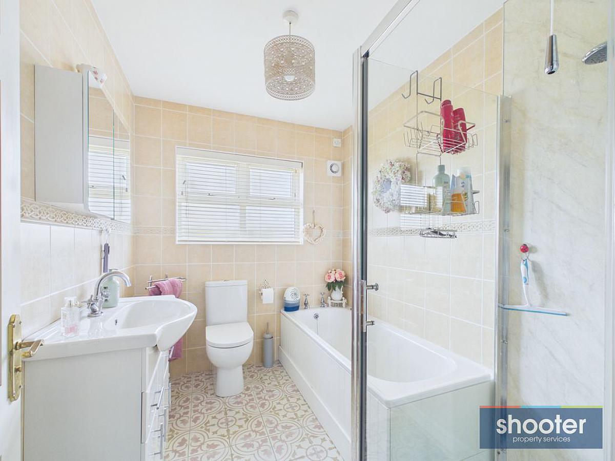Toilet, vanity unit with wash hand basin, bath and shower with Triton electric shower unit. Vanity unit. Ceramic tiled floor and walls.