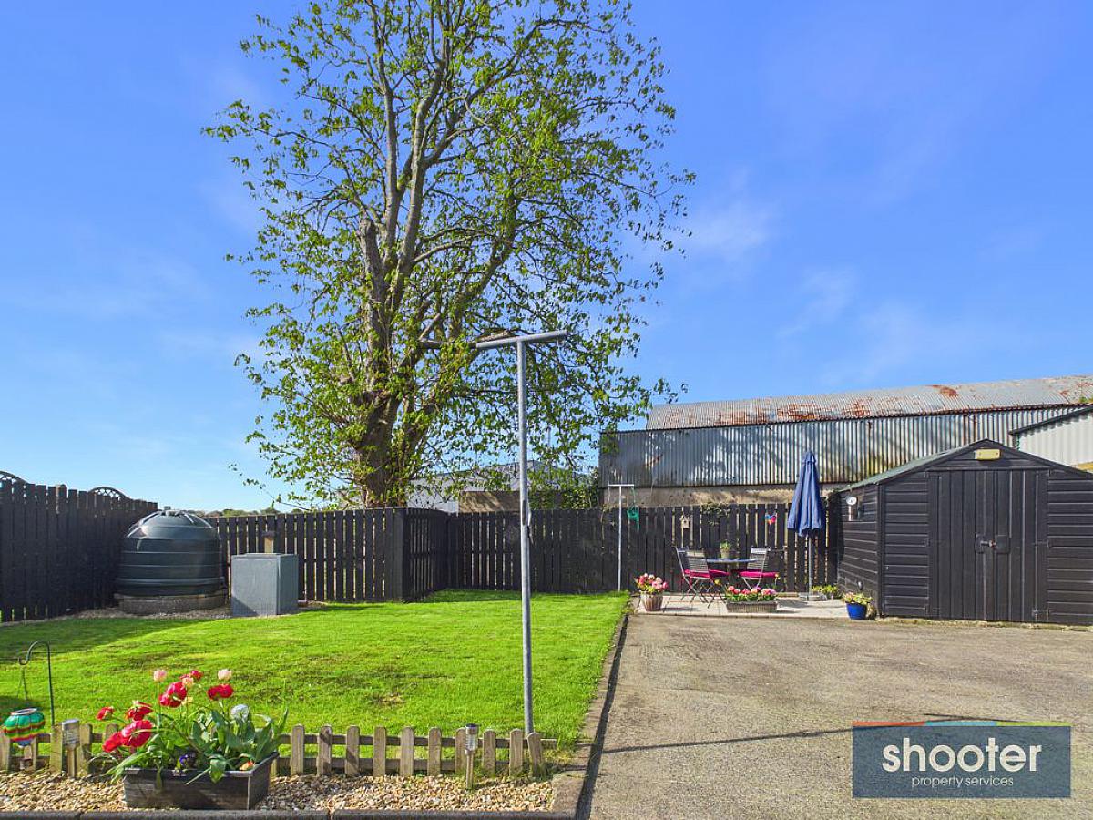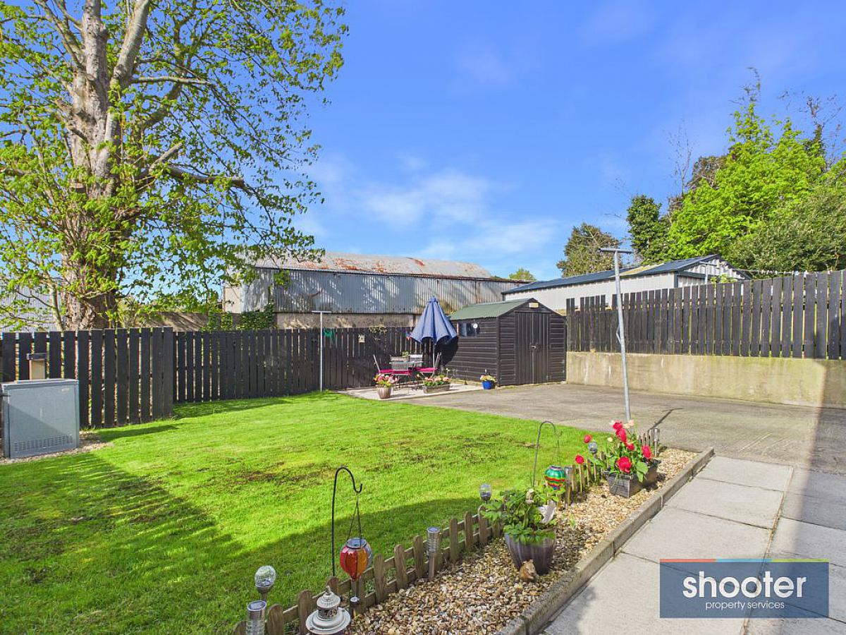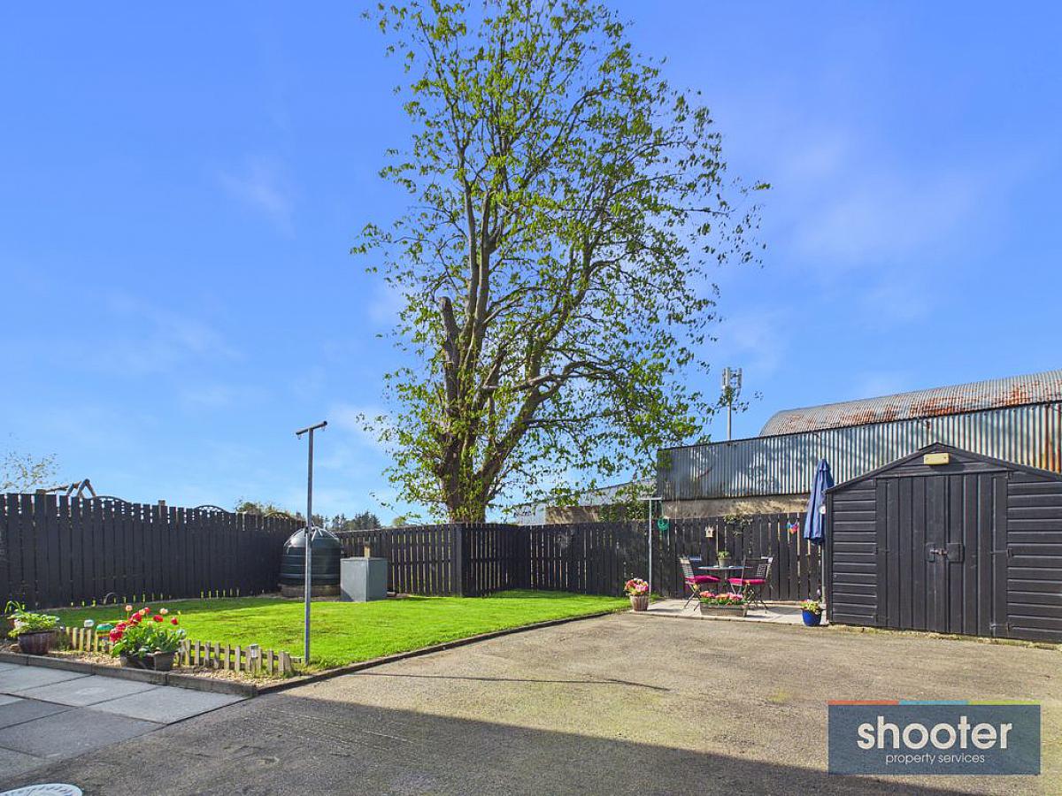 Tarmacadam driveway with parking to side. Front grass lawn. Entrance canopy. Concrete yard to rear. Paved patio area with neat grass lawn, decorative stone beds and garden shed. Clothesline, watertap and outside light.