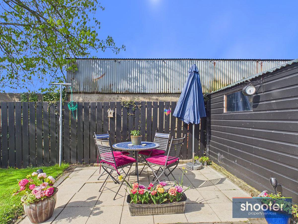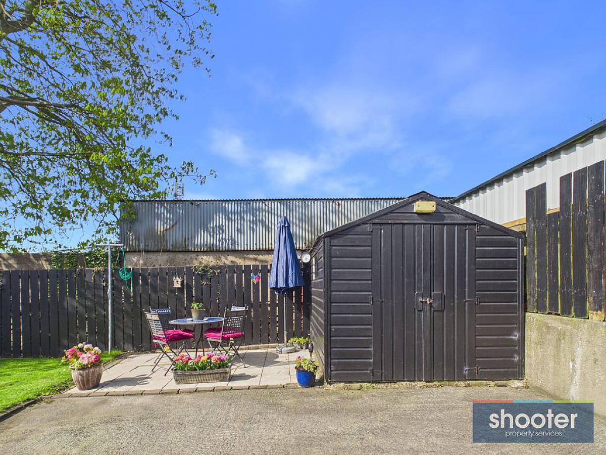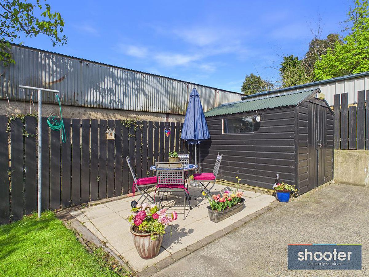 Tarmacadam driveway with parking to side. Front grass lawn. Entrance canopy. Concrete yard to rear. Paved patio area with neat grass lawn, decorative stone beds and garden shed. Clothesline, watertap and outside light.