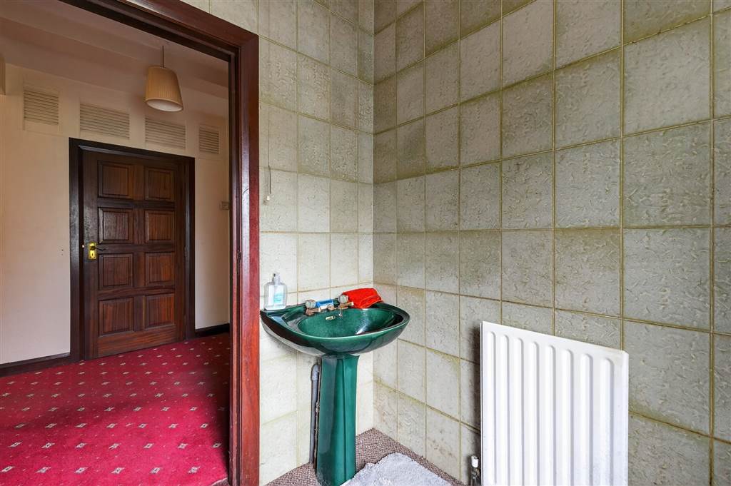 Pedestal wash hand basin. WC. Built-in storage under stairs. Tiled walls.
