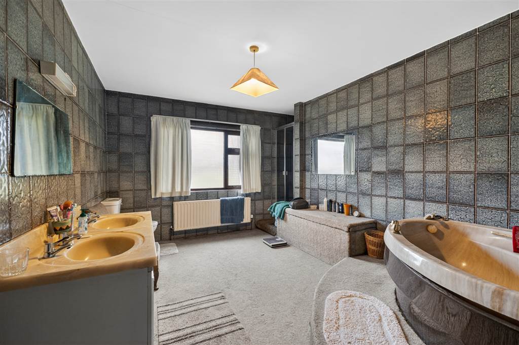 Raised corner bath with seating area, handgrips and mixer tap. Twin vanity unit with twin sinks. WC. Shower cubicle.