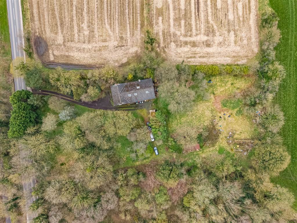 Hardcore driveway leading to spacious parking to front and side. The house is well sheltered from the road by high density of trees and shrubs. Two dilapidated cottages.