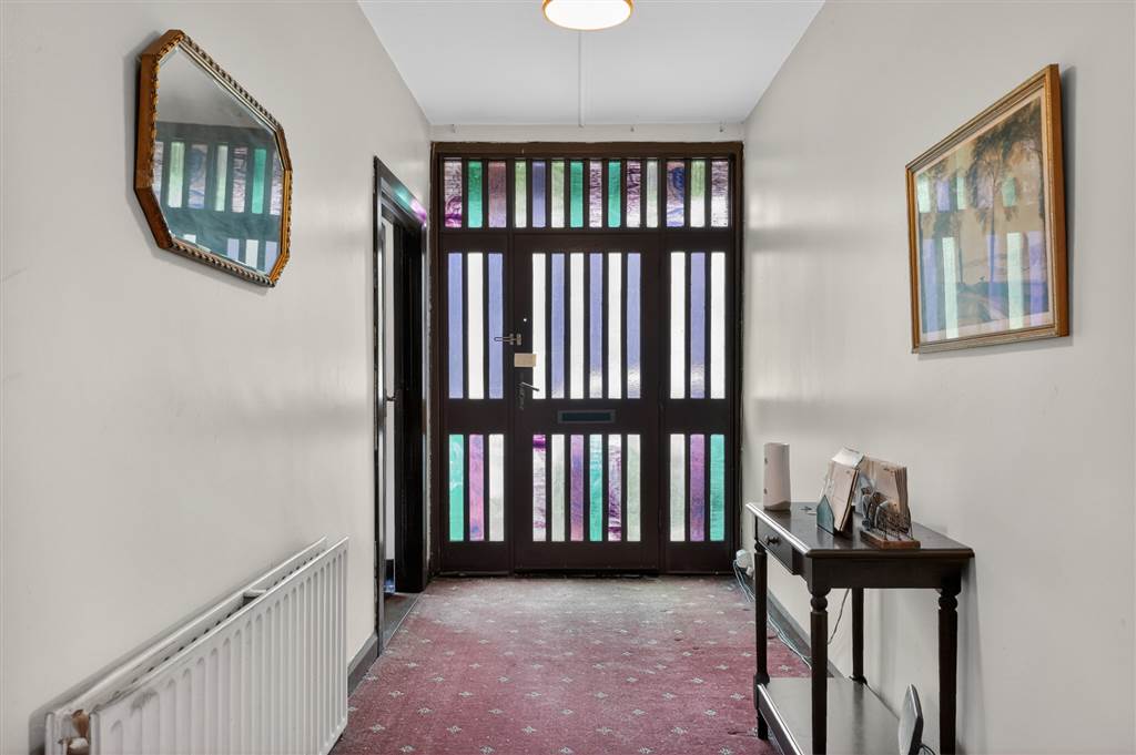Hardwood coloured glazed front doors. Cloaks cupboard with coat hooks.