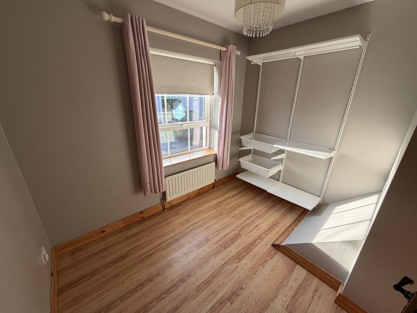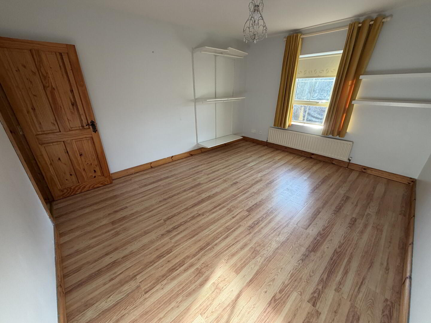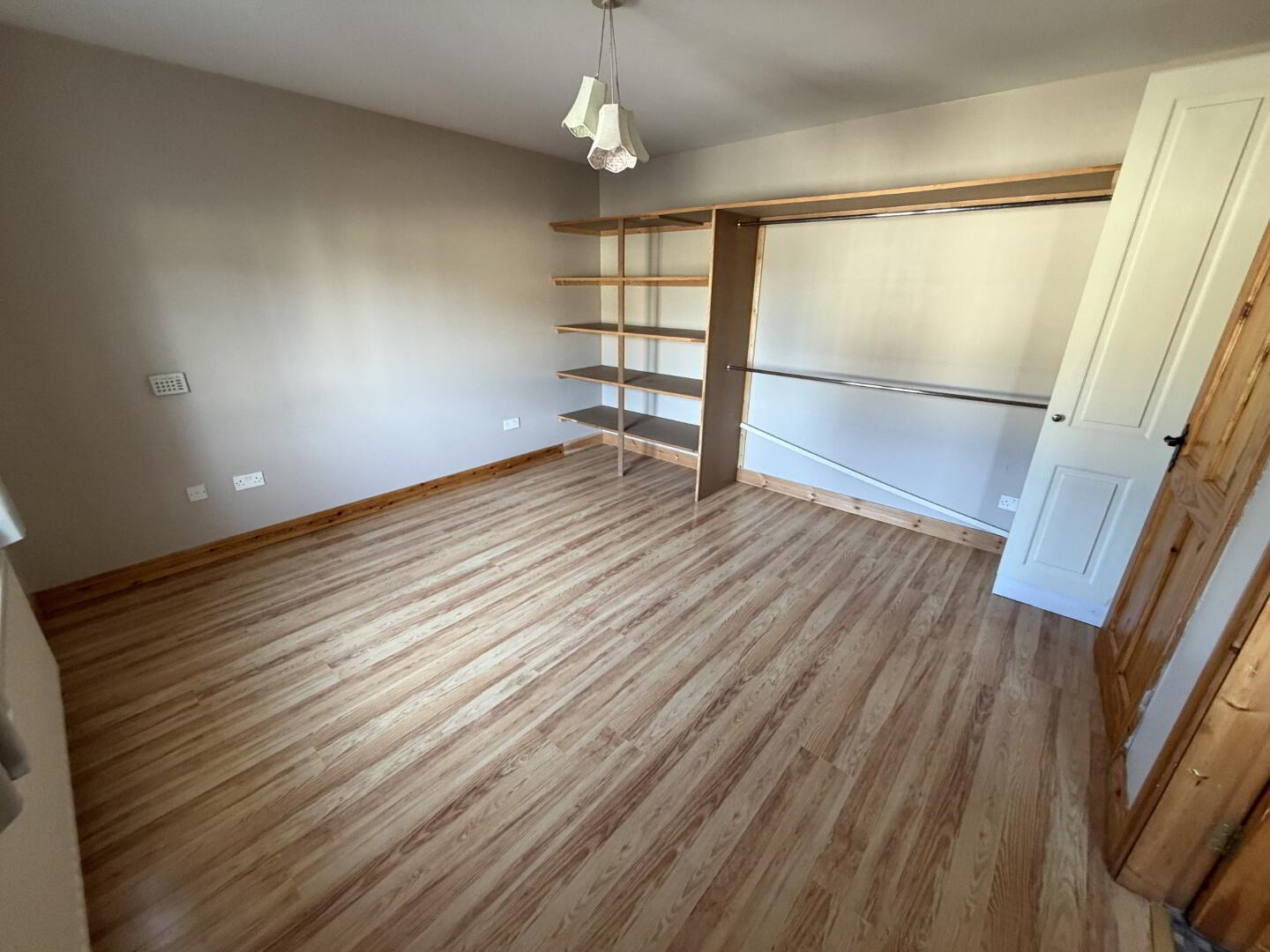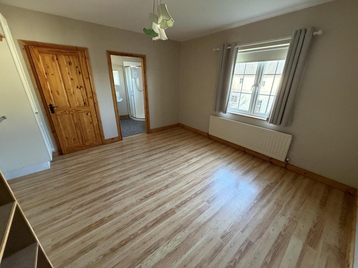 A spacious master bedroom finished with wooden-style flooring and ample wardrobe space. The room further benefits from an en-suite shower room.