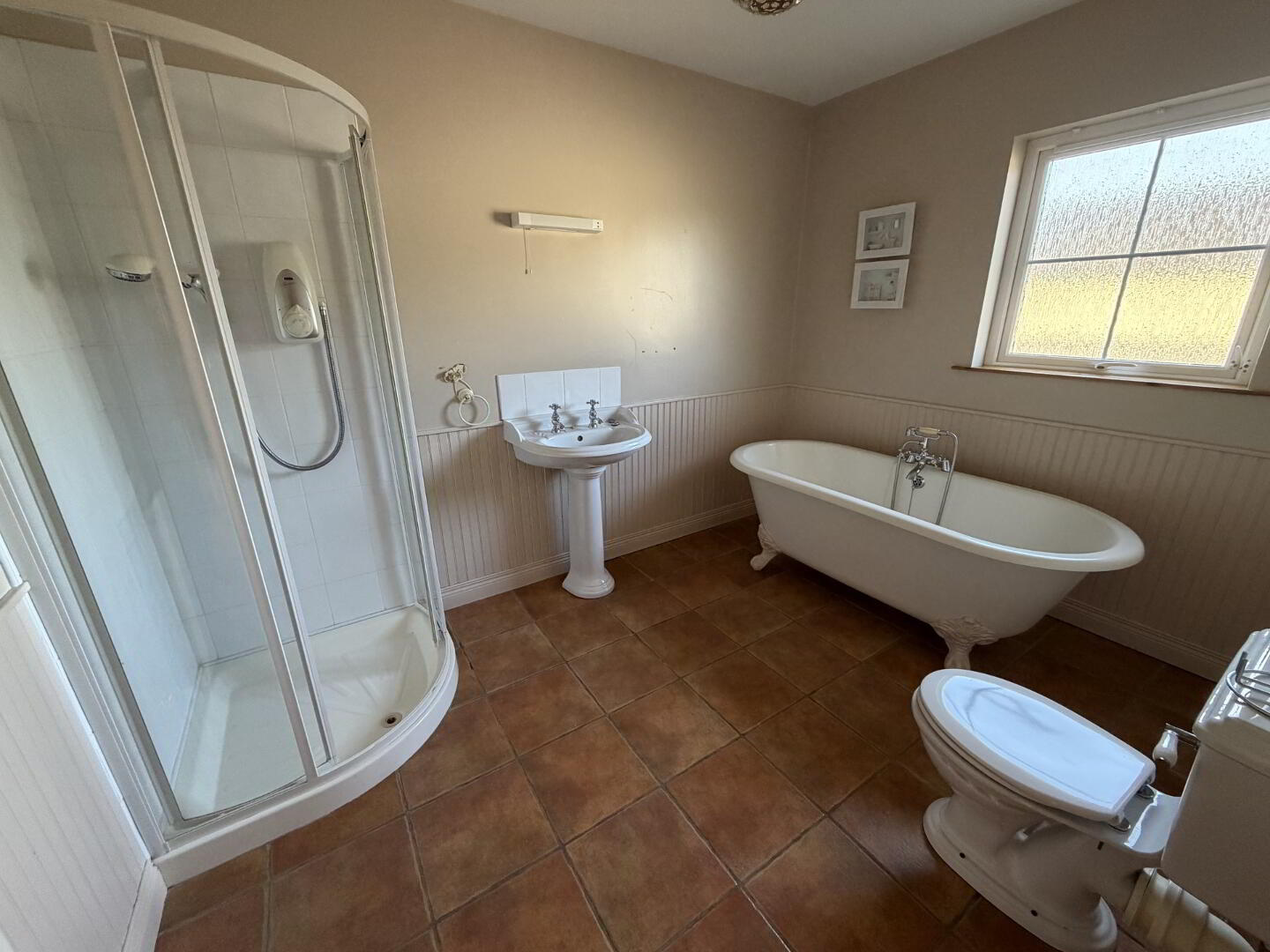 A spacious four-piece family bathroom comprising an electric corner shower, WC, wash hand basin, and a striking standalone claw-foot bathtub. Finished with tiled flooring, this room offers both style and functionality.