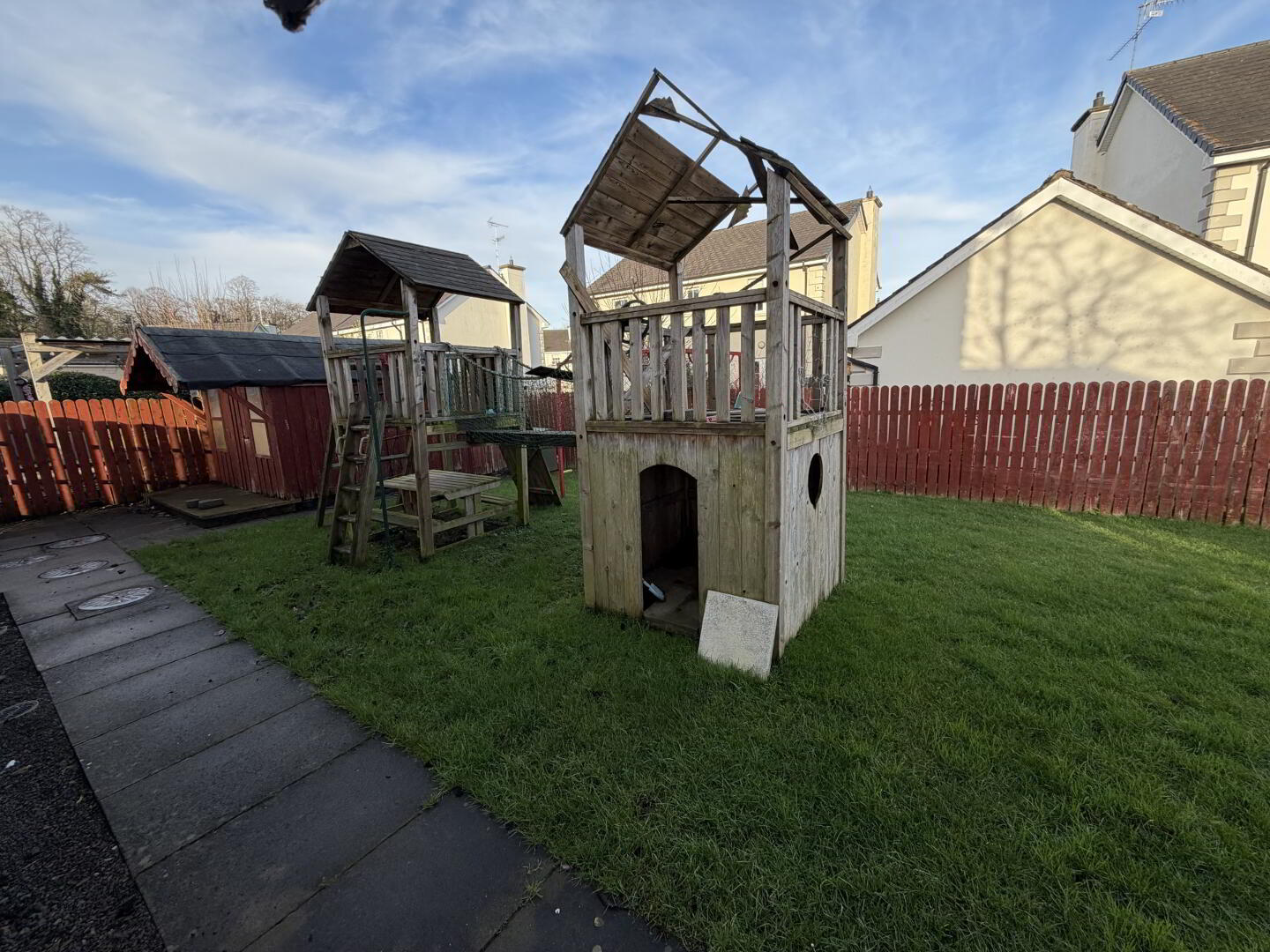 The property benefits from multiple off-street parking spaces to the front. To the rear and side, there is a large garden laid in lawn, providing excellent outdoor space for families, entertaining, or future landscaping potential.