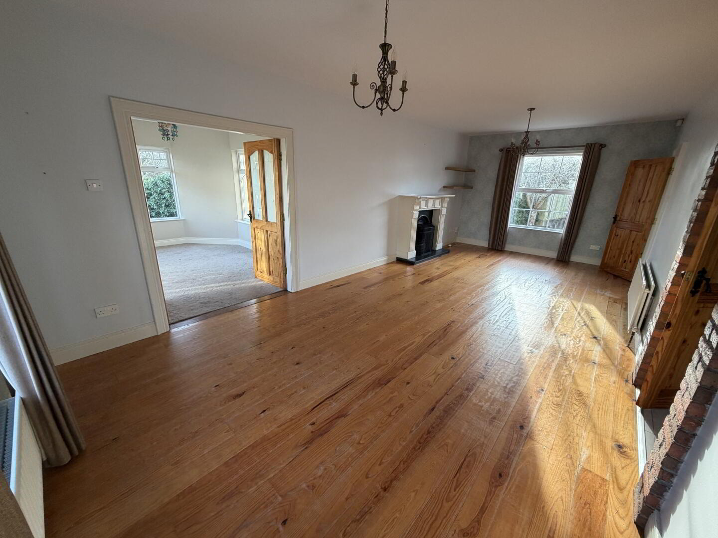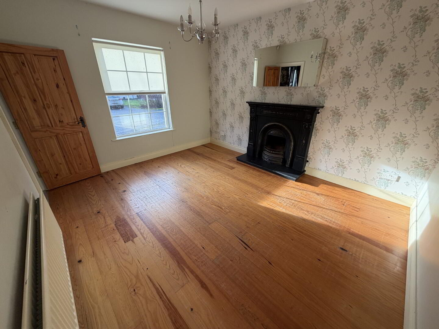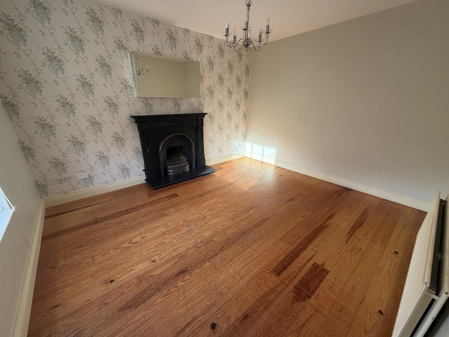 A well-proportioned front reception room featuring wooden-style flooring and a charming open fireplace with cast iron surround and inset, creating a warm and inviting focal point.