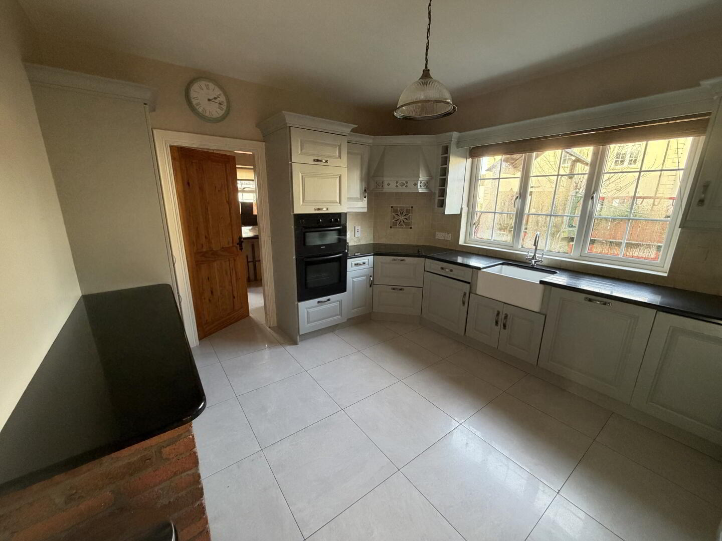 A fully fitted kitchen comprising a range of high- and low-level units, complete with a Belfast sink and a selection of integrated appliances, including fridge freezer, dishwasher, double oven, and hob. Finished with ceramic tiled flooring, the kitchen also benefits from a breakfast bar, designated dining area, and direct access to the utility room.
