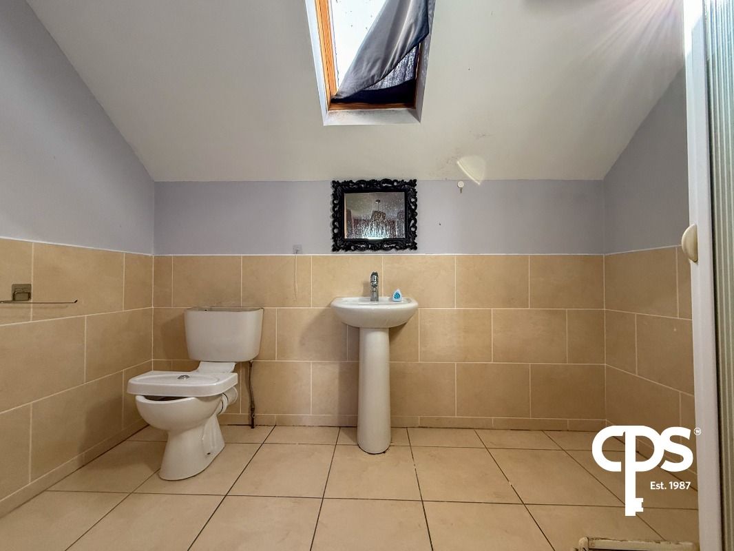 Comprising WC and wash hand basin with tiled flooring.