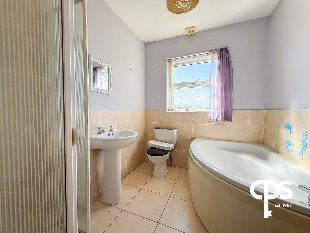 Fully tiled family bathroom comprising WC, wash hand basin, corner bath, and separate power shower.