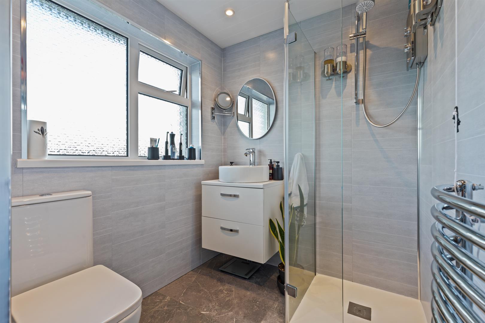 Modern Shower Room With Walk-In Shower, Vanity Storage And Heated Towel Rail