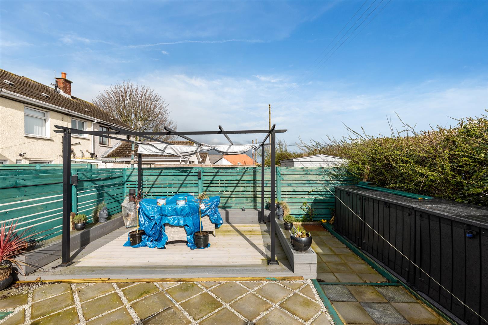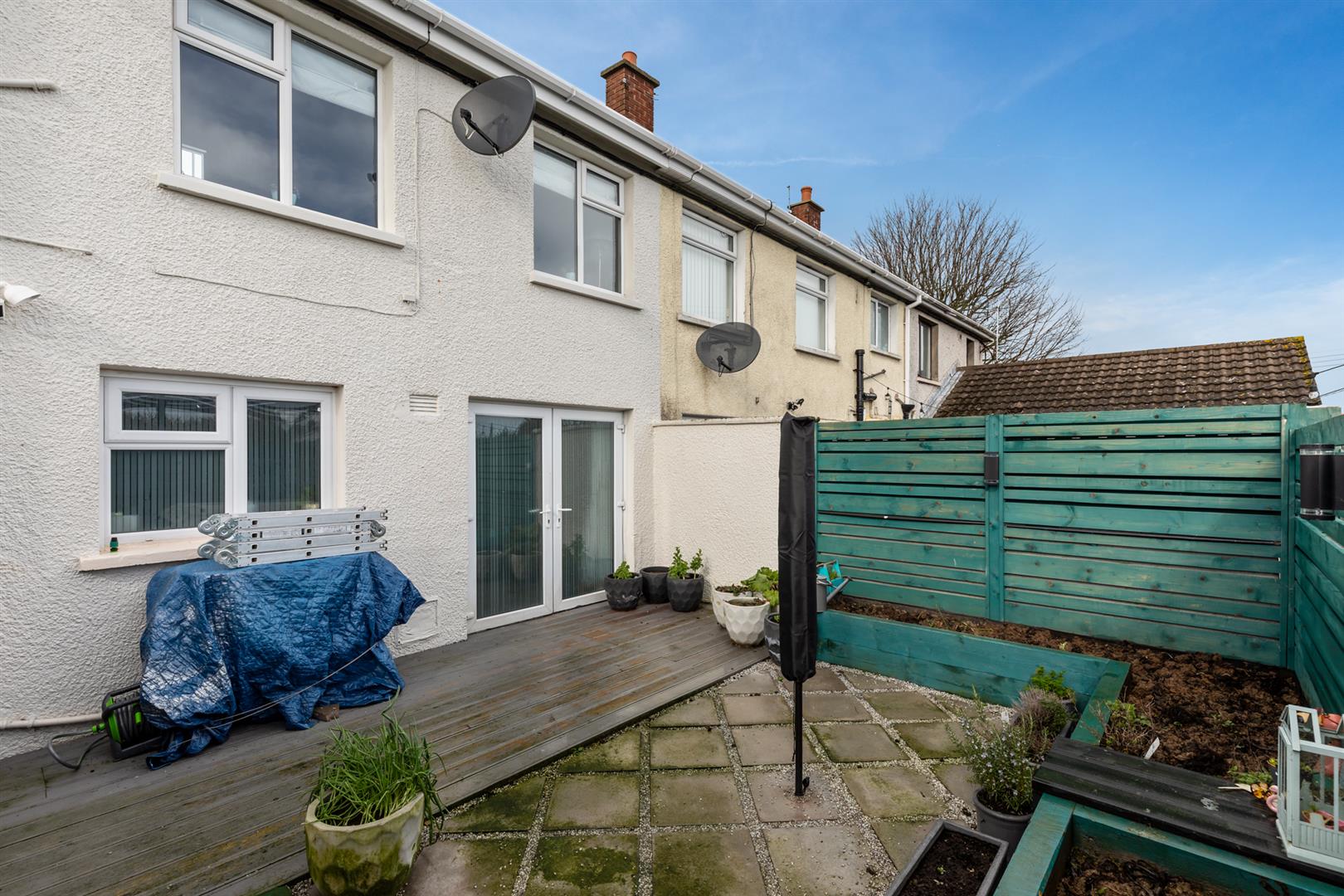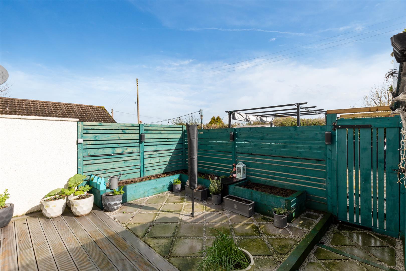 Rear - Fully enclosed yard, area in decking, area in patio, raised beds, outhouse with space for storage and plumbed for appliances, outside tap and light.