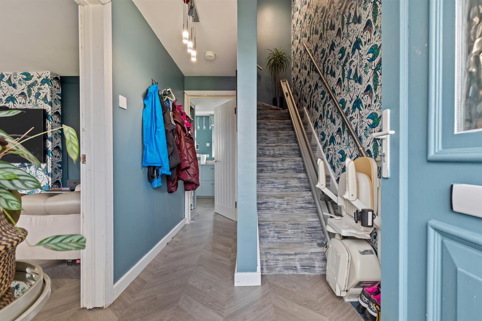 Wood laminate flooring, cloak space.