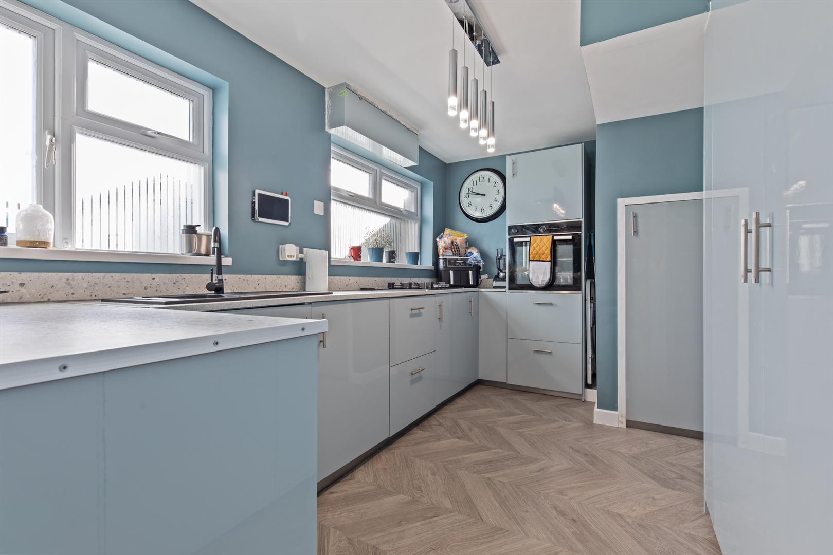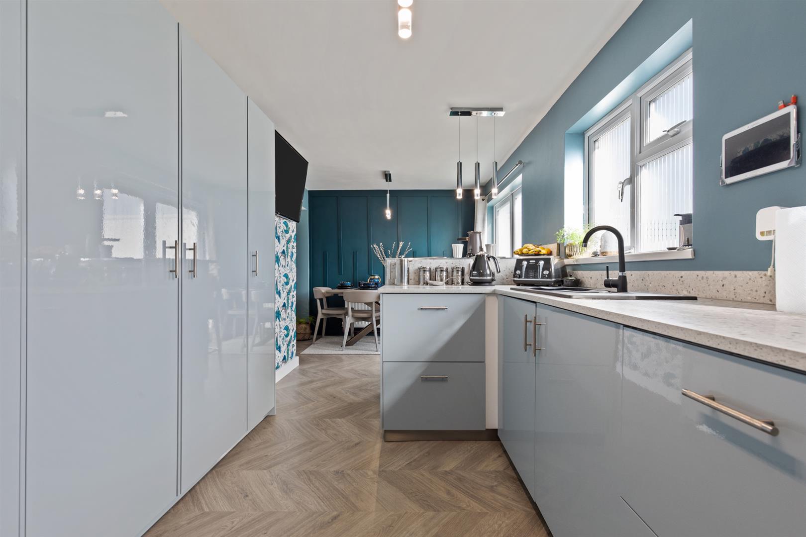 Modern fitted kitchen, range of high and low level units, laminate work surfaces, single sink with mixer tap with drainer, integrated dishwasher, integrated oven, four ring gas hob, space for fridge/freezer, larder cupboard, breakfast bar, space for dining, wood laminate flooring, double patio door into the enclosed rear garden.