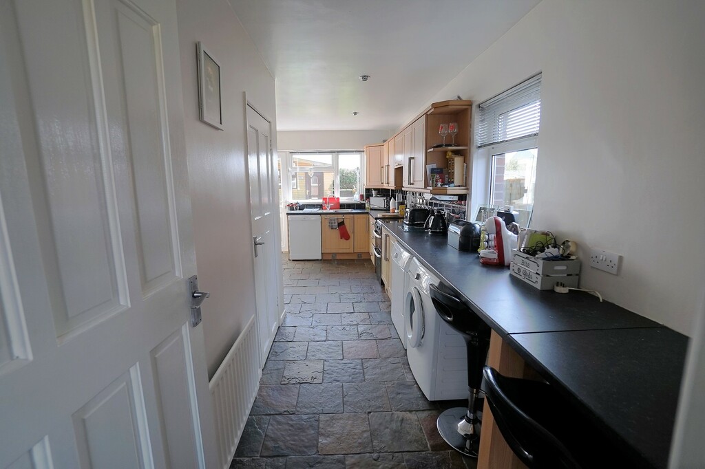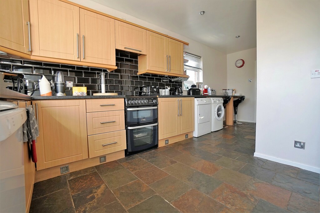Ample range of high and low level units. Breakfast bar. Housing for white goods. Tiled floor. Storage/pantry.