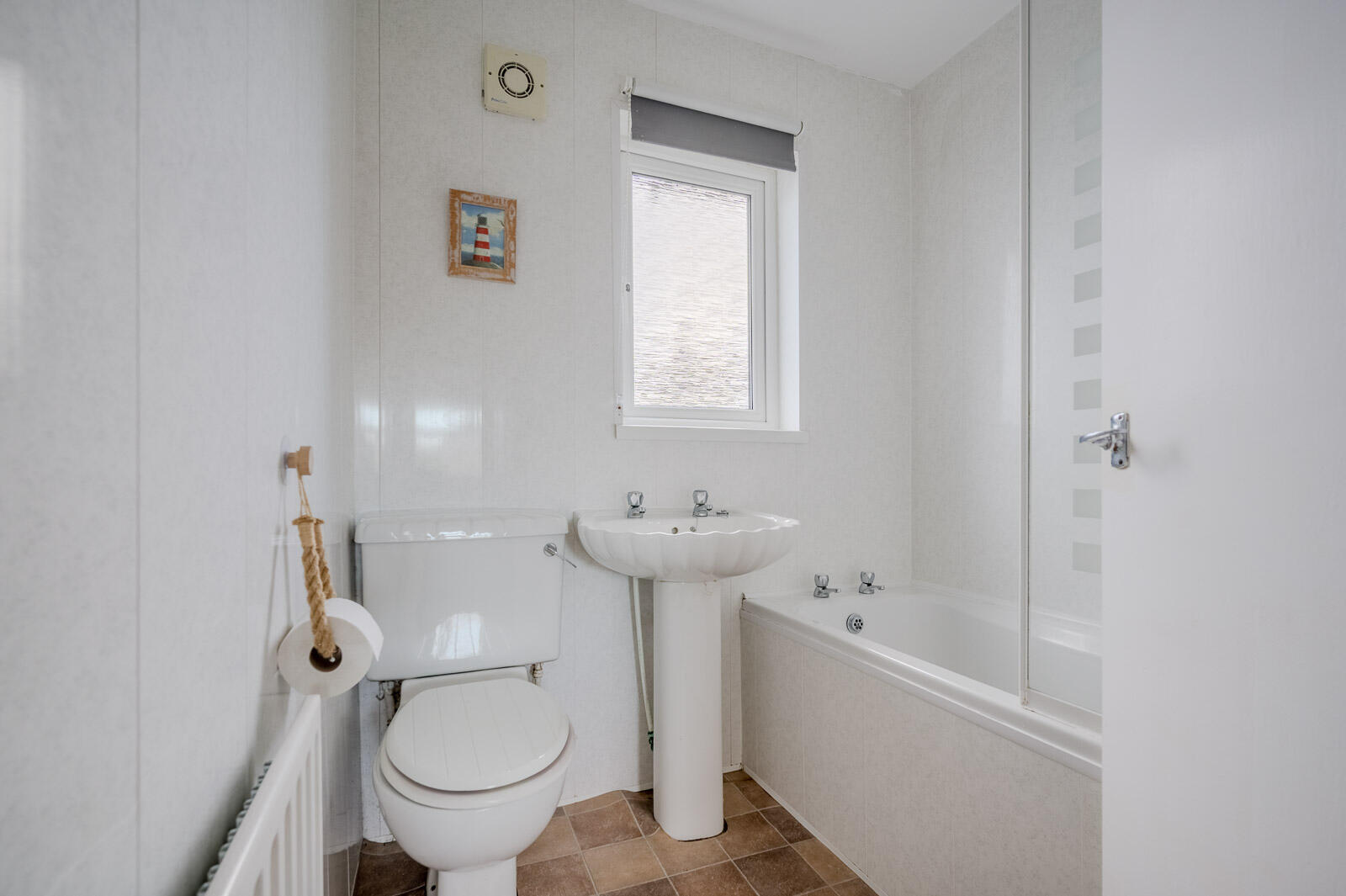 Three piece suite comprising panelled bath with Bristan electric shower over, pedestal wash hand basin, low flush WC, extractor fan.