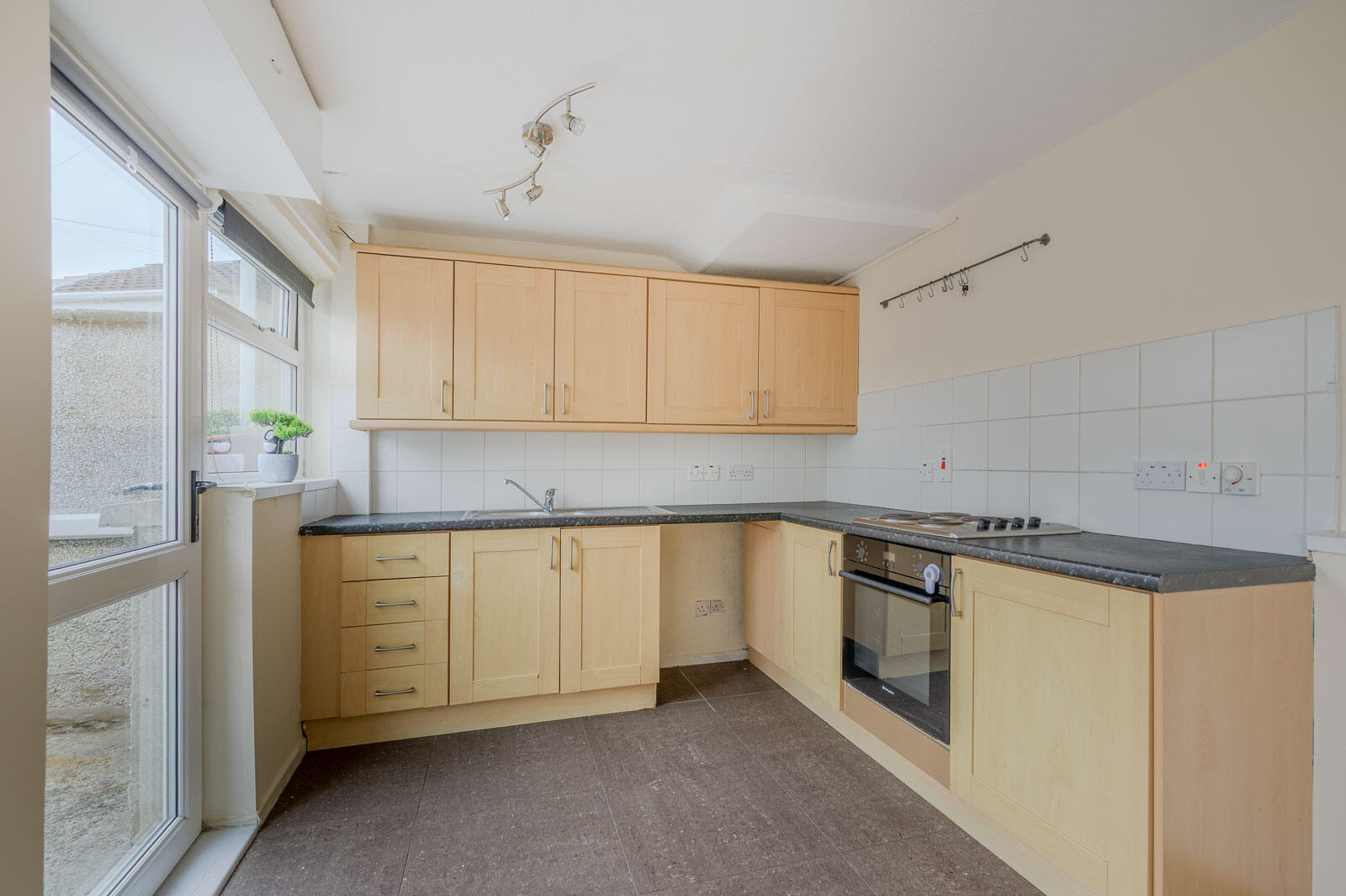 Range of high and low level Shaker style units, laminate effect work surfaces, one and a half bowl single drainer stainless steel sink unit with mixer tap, integrated oven, integrated four ring hob, tiled splashback, plumbed for washing machine, part tiled floor, part laminate wood effect floor, part tiled walls, uPVC double glazed door to outside.