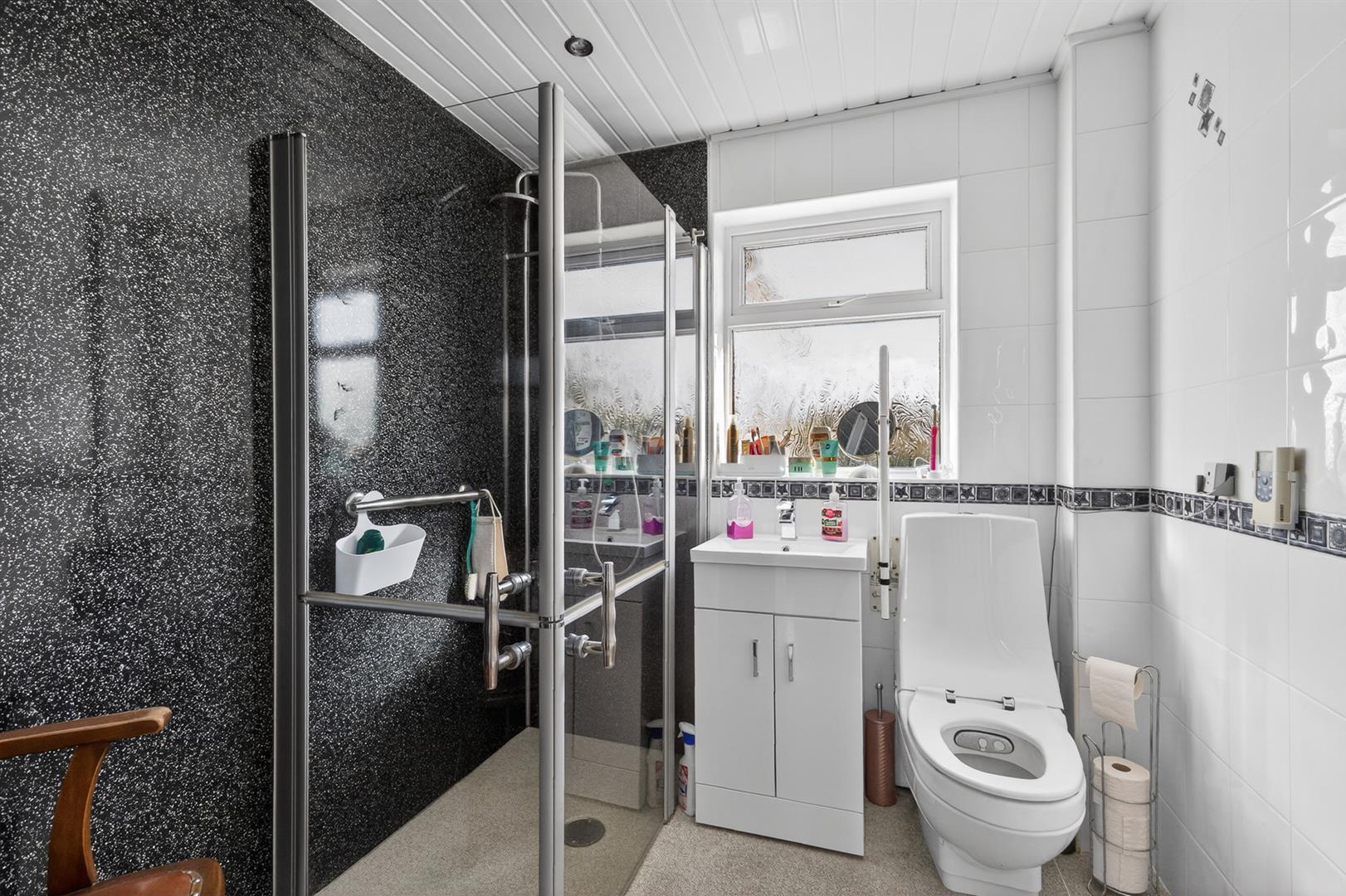 Three piece suite comprising shower cubicle, wash hand basin with mixer taps, storage beneath, Gerberit dual function WC with loo and bidet settings, part tiled walls, Non Slip Flooring chrome heated towel rail.