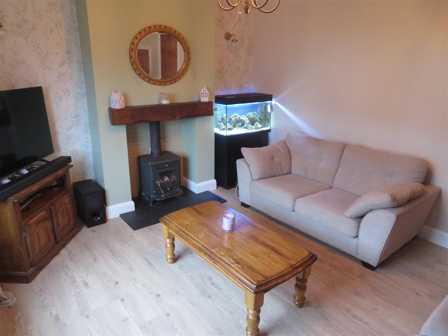 The home boasts a bright living room featuring a stove, creating a warm and inviting focal point, alongside an attractive modern kitchen fitted with stylish two-tone units. A ground floor bathroom adds to the practicality of the layout.