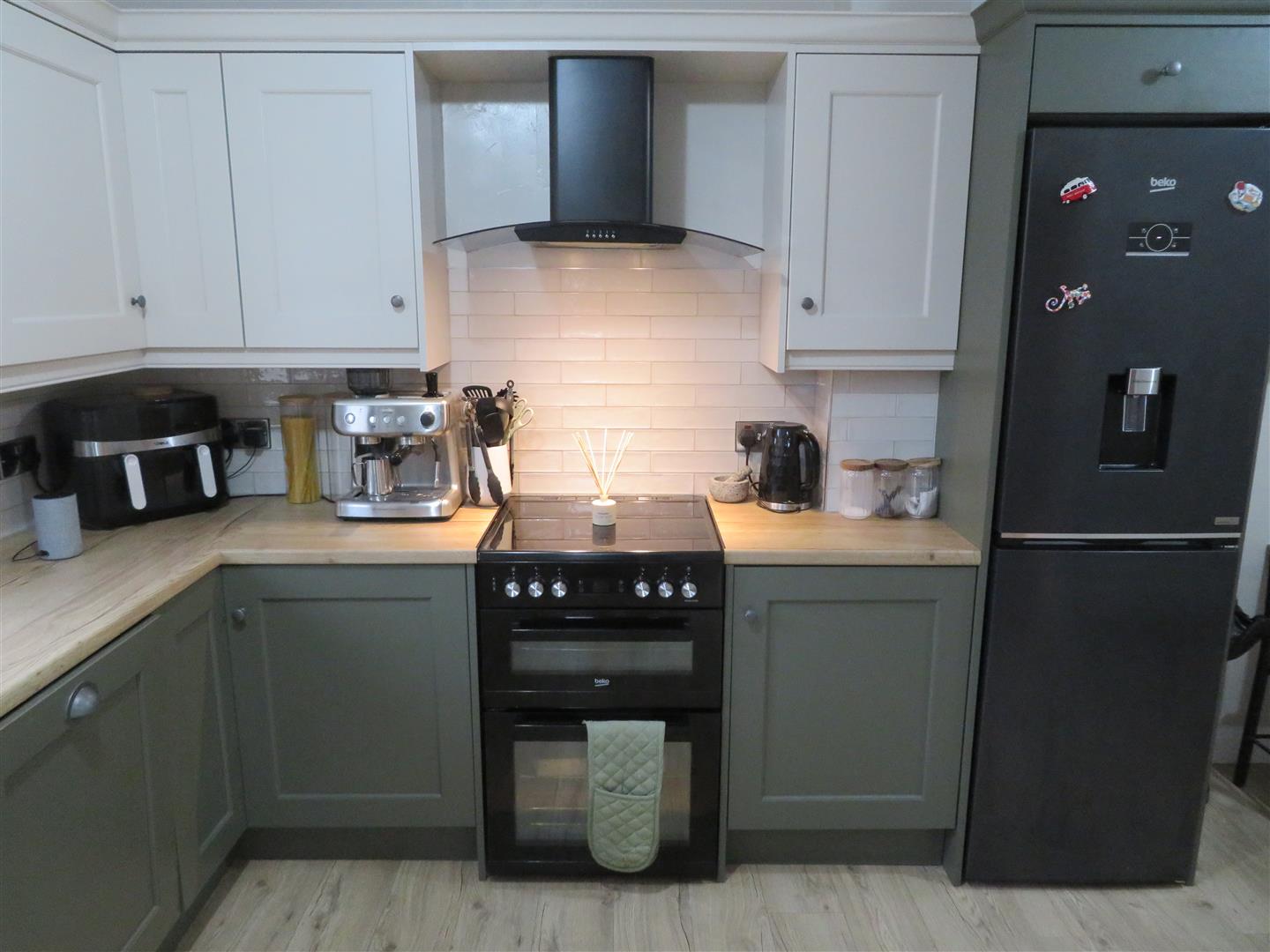 Attractive two tone kitchen boasting good range of high and low level fitted units, space for free standing cooker with extractor above, space for free standing fridge freezer, plumbed space for washing machine and integrated dishwasher, laminate flooring, partially tiled walls and PVC back door to rear.
