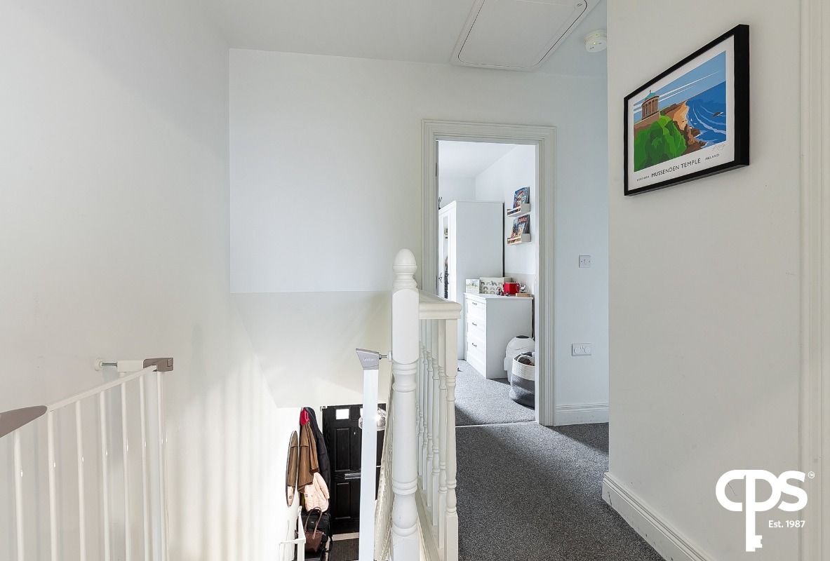 Carpeted landing on first floor with roof space hatch and ladder. Roof space is floored and shelved for ample storage space.