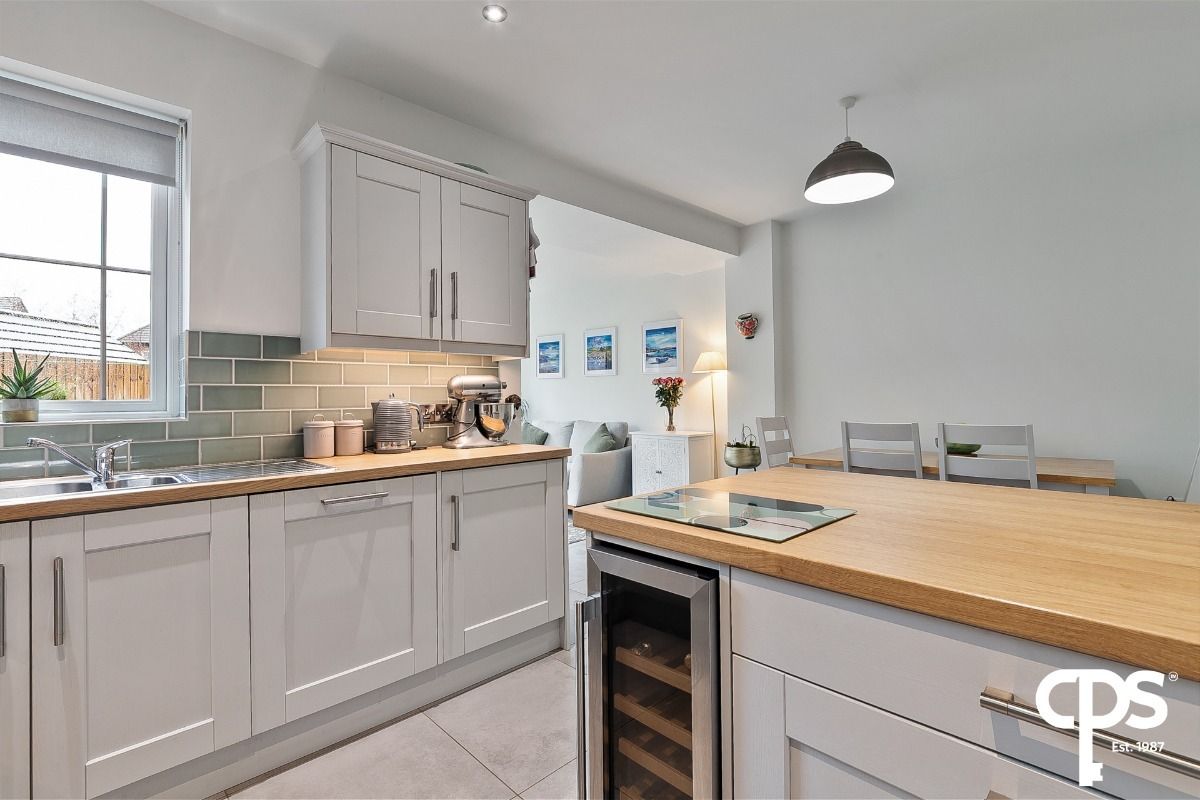 An open-plan kitchen/dining area featuring a modern fitted kitchen with high and low units, tiled flooring, and a sleek tiled splashback, complemented by integrated appliances including a fridge/freezer, wine fridge, four-ring gas hob, extractor fan, washing machine and dishwasher. This well-proportioned open-plan space offers generous room for both dining and entertaining