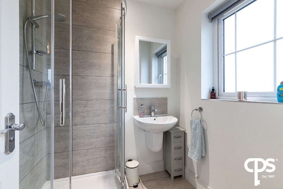Three-piece white suite with corner shower, wc and floating sink. Ensuite has a sleek finished with tiled floors and surround.
